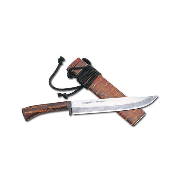 日本刀からの伝統を受け継ぐ白紙多層鋼を鍛造した刃に、美しい山桜の皮を使ったハンドルとケースで構成されています。伝統工芸士 佐治 武士氏の美しい一品です。