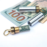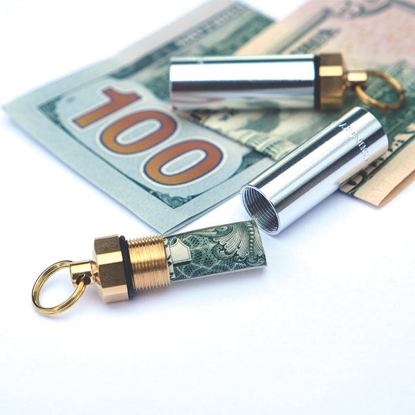 A&F エイアンドエフ スタッシュケースは近くにATMが無かったり不意に停電になった時、最も必要な現金をコンパクトに折り畳んで携帯できるキーホルダー型防水カプセルです。