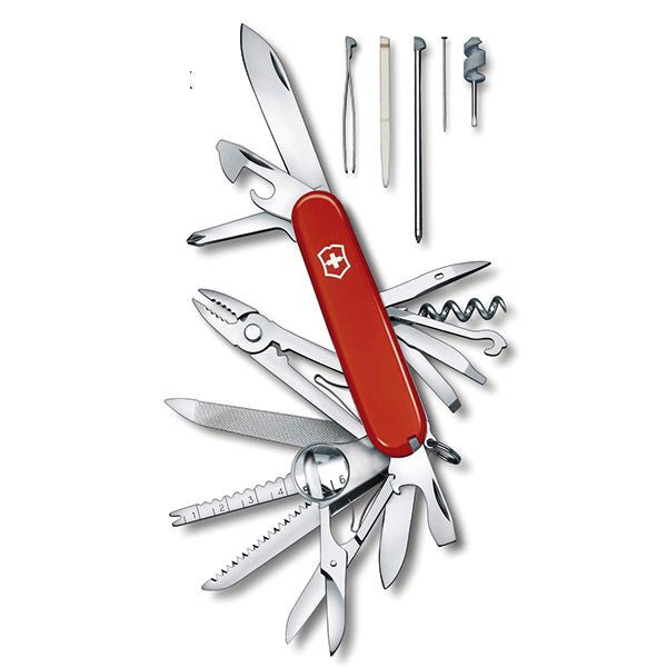 VICTORINOX ビクトリノックス スイスチャンプはわずか91mmのボディに、大小のブレードはもちろん、はさみからプライヤー、のこぎり、カン切り、コルクせん抜き、ルーペまで装備された最高峰モデルです。