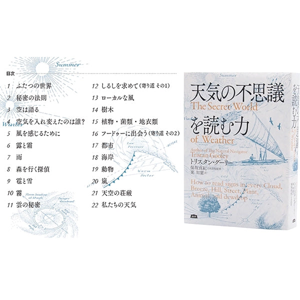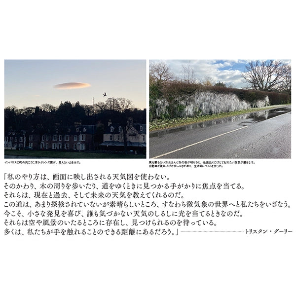 「私のやり方は、画面に映し出される天気図を使わない。そのかわり、木の周りを歩いたり、道をゆくときに見つかる手がかりに焦点を当てる。それらは、現在と過去、そして未来の天気を教えてくれるのだ。この道は、あまり探検されていないが素晴らしいところ、すなわち微気象の世界へと私たちをいざなう。今こそ、小さな発見を喜び、誰も気づかない天気のしるしに光を当てるときなのだ。それらは空や風景のいたるところに存在し、見つけられるのを待っている。多くは、私たちが手を触れることのできる距離にあるだろう。」 トリスタン・グーリー