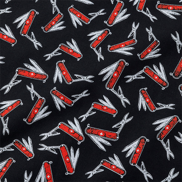 マットなブラックの背景に散りばめられているのは、鮮やかなレッドのボディとシルバーのツールが特徴的な、あの多機能ナイフ。ナイフ、ハサミ、プライヤーなど、開いた状態のツールと閉じた状態のツールがランダムに配置され、その精巧なディテールが、見る人の知的好奇心をくすぐります。まるで道具箱をひっくり返したような、ユニークでありながらもスタイリッシュなデザインです。