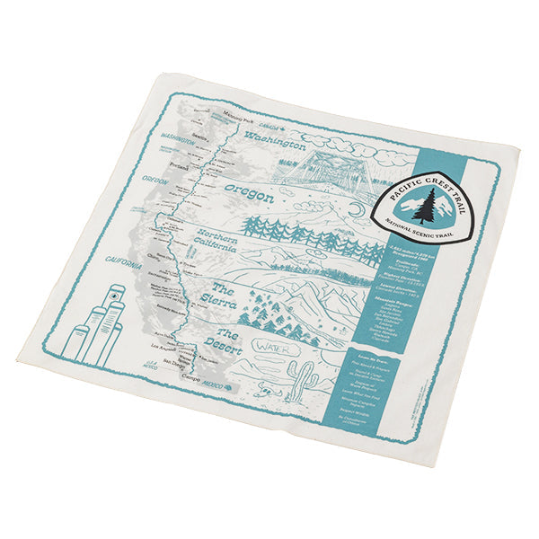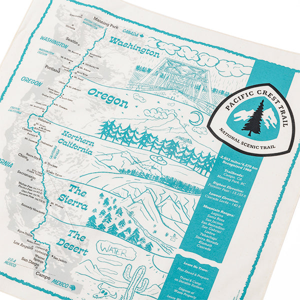 このバンダナは、メキシコ国境からカナダ国境まで、カリフォルニア州、オレゴン州、ワシントン州を縦断する約4,265kmのロングトレイル、パシフィッククレストトレイルの魅力を凝縮した一枚です。カリフォルニアの砂漠地帯から、シエラネバダ山脈の峻厳な山々、オレゴンの豊かな森林、そしてワシントン州の壮大な山岳地帯まで、変化に富んだ景観がこの一枚に収められています。