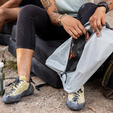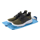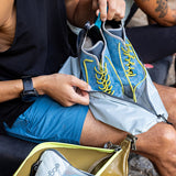 旅行やジム、スポーツ、学校、オフィスなどで靴を持ち歩く際に活躍します。旅行の際にコーディネートに合わせて靴をひとつ追加で持って行く場合、このシューサックに入れておけば、かばんの中での収まりもよく、ビニール袋に入れるよりもパッキングがはるかに楽になります。31cm程度の靴まで収納することができる大きさで、旅行バッグに収納する際には、靴で他の衣類やアイテムを汚すことなく別々に収納することができます。生地はとても軽く、耐水性がある100%海洋リサイクル生地を使用し環境にも配慮しています。