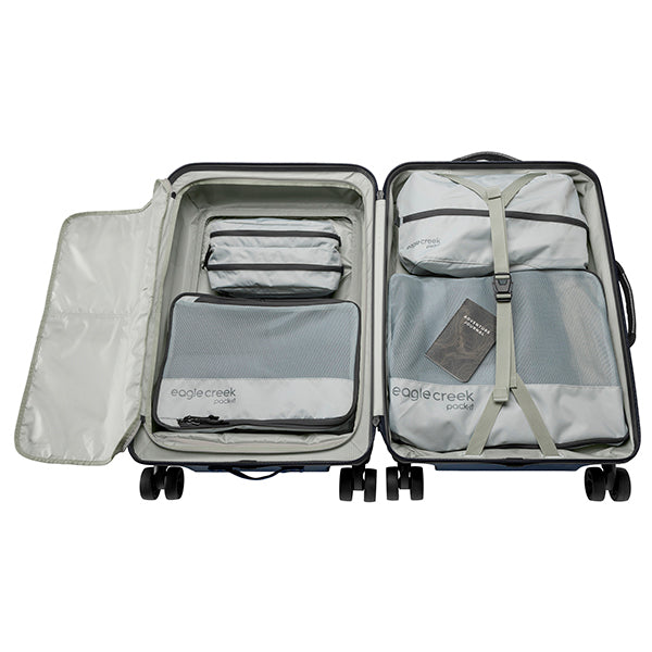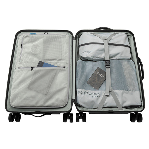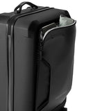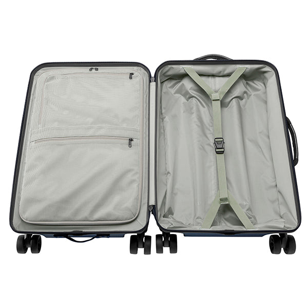 67Lの容量のこのキャリーバッグは、1週間前後の旅行や出張に丁度良いサイズです。ハードケースとソフトケースの両方の長所を活かした設計が特徴のハイブリットキャリーバッグで、ポリカーボネート製のハード素材部分が外部からの衝撃から中身をしっかり守り、長期の旅行や海外旅行にも安心して使えます。フロント面のソフト素材部分は、外側からすぐにアクセスできるポケットがデザインされ、必要なものを必要な時に取り出せます。頑丈な4輪キャスターはどの方向にもスムーズに動くので、混雑した場所でもストレスなく、より快適に荷物を運べます。フラットな地面や床で立てたまま楽に押したり引いたりでき、荷物が重くなった場合も移動がスムーズです。さらに、内側には調節可能なコンプレッションベルトが付いており、 荷物のかさばりを押さえてしっかり固定。メッシュ素材のポケットが付いた仕切りもあるので、移動中のバッグの中で荷物が偏りにくく、整理整頓しやすい設計です。側面4か所にハンドルを設置し、どの向きでキャリーバッグを棚にしまっても、簡単に引き出すことができます。