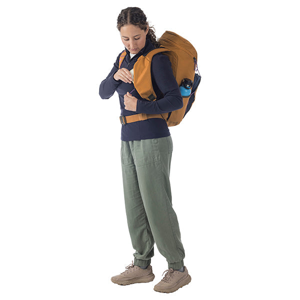 本体には100%海洋リサイクルのGRS認証素材を採用しており、地球に優しく、耐久性も抜群で長く使える安心感を提供します。長時間背負っても蒸れにくい通気性の良いパッド入りハーネスと背面パネルで快適性を追求し、緊急ホイッスル付きのチェストストラップや収納可能なヒップベルトは、自転車移動やトレッキング時に安定感をもたらし、安全性を高めます。大きめのフロントポケットは、ジャケットなどの荷物だけでなく、駅の切符やスマートフォンといったすぐに取り出したい必需品へ素早くアクセス可能。内部スリーブには13インチのノートパソコンやハイドレーションを収納でき、ボトルポケットと合わせてハイキング中の水分補給もスムーズに行えるなど、あらゆるニーズに柔軟に対応します。さらに、夜間の走行に役立つバイクライト用ループ、キャリーバッグのハンドルに固定できるトロリースルーパス、そしてセキュリティを高める隠しパスポートポケットも完備。日常使いからスーツケースの予備デイパック、機内持ち込み用まで、旅の使いやすさを両立した、高い汎用性を持ったバックパックです。
