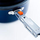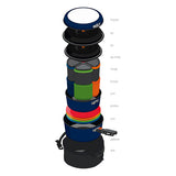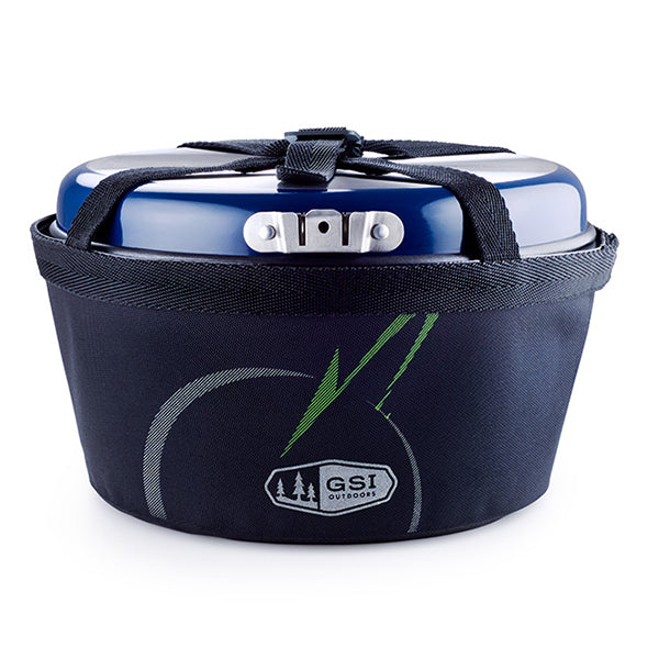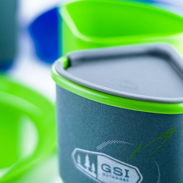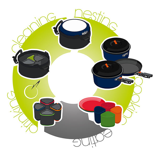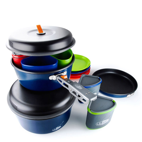 頑丈なスタッフサックはこのセットをしっかりまとめると同時に水を溜める事が出来る為、洗面器、もしくは食器洗いのシンクとしても活用が出来ます。セット内の食器は4色に色分けされており、一人ずつ違う色で使用することができるため、誰がどれを使っているかも直ぐに見分けることができます。GSI Outdoors独自のフォールディングポットグリッパー(持ち手)はポット、フライパンの外側に付いたアタッチメントに簡単に取り付けが出来る為、内側のコーティングに傷をつけることも無く、ロックを掛ける事で安全も確保できます。片付けの際も取り外してポットの中に収納できるユニークなネスティングデザインになっています。衝撃に強いストレーナー機能付きの蓋はBPAフリー素材を使用。フライパンとポット両方で使用が可能です。
