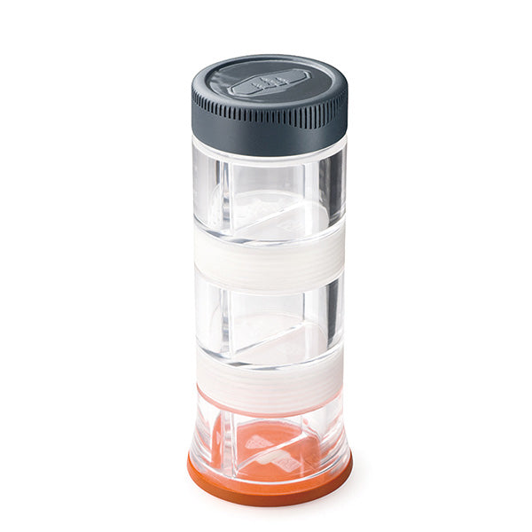 それぞれの段はねじ込みで着脱が可能で不必要なケースを外すことも追加することもできます。段毎に穴の付いた内蓋があり、1つは大きめの穴の内蓋となっています。透明度が高く見分けやすくなっております。キャンプでも登山でも散らばりがちな調味料をすっきりまとめてくれる名作です。