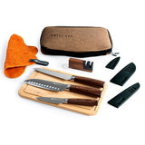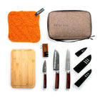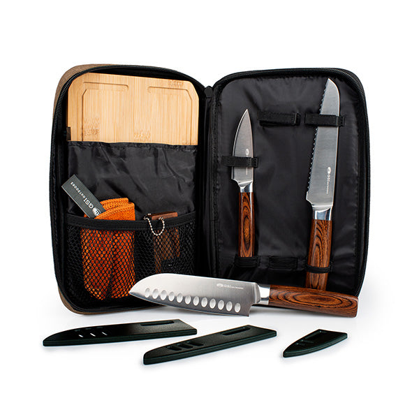 GSI ジーエスアイ ラカウ ナイフセットは果物ナイフ、パン切ナイフ、SANTOKUシェフナイフ、シャープナー、まな板、キッチンクロス、がセットになったキャンプ調理セットです。