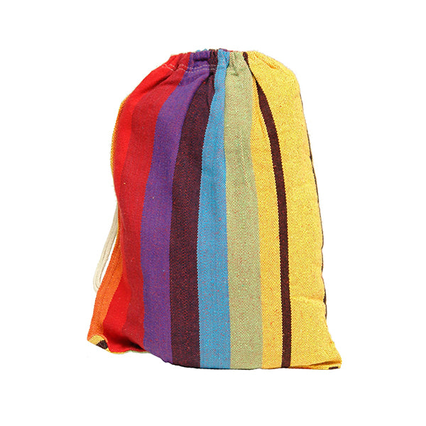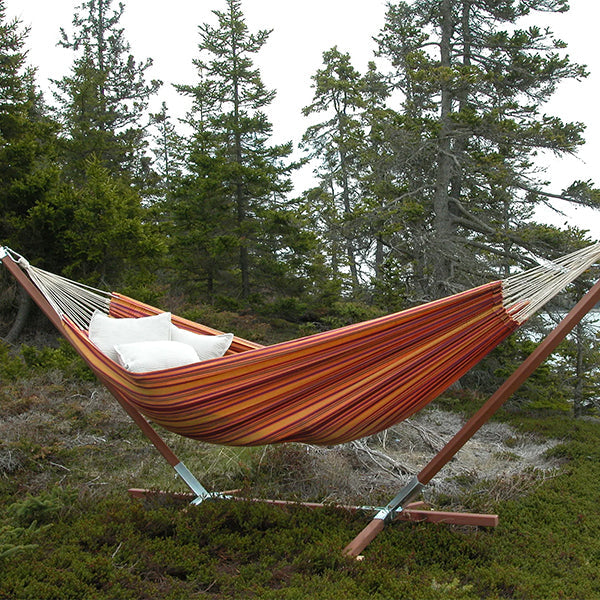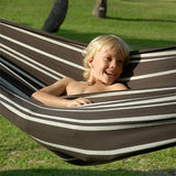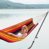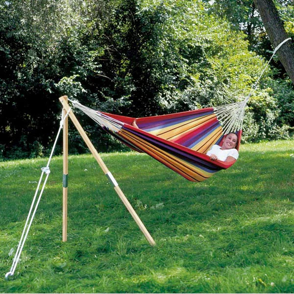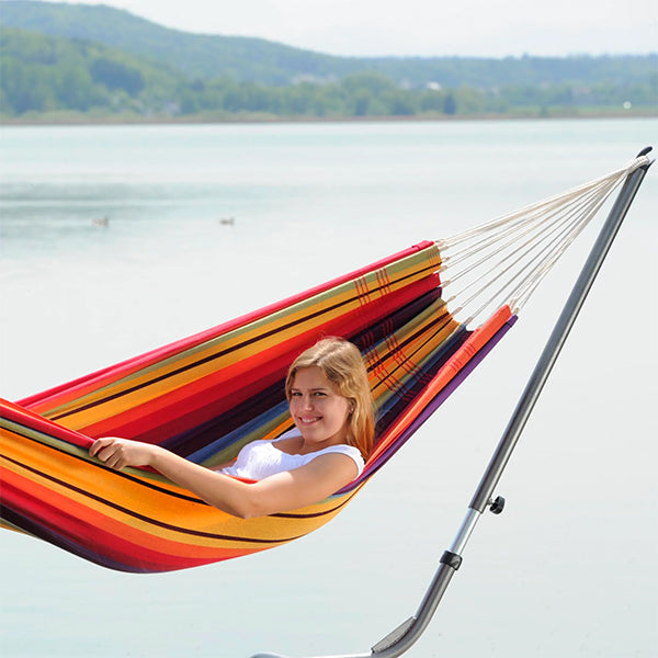 ブラジルスタイルのハンモックは、肌触りが良く、通気性も優れているので、キャンプやご家庭で快適なひと時を過ごしていただけます。