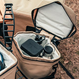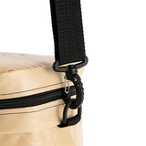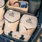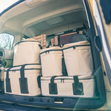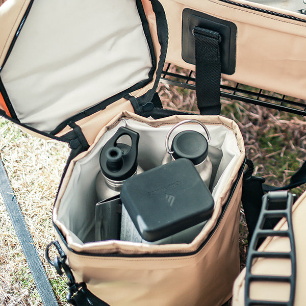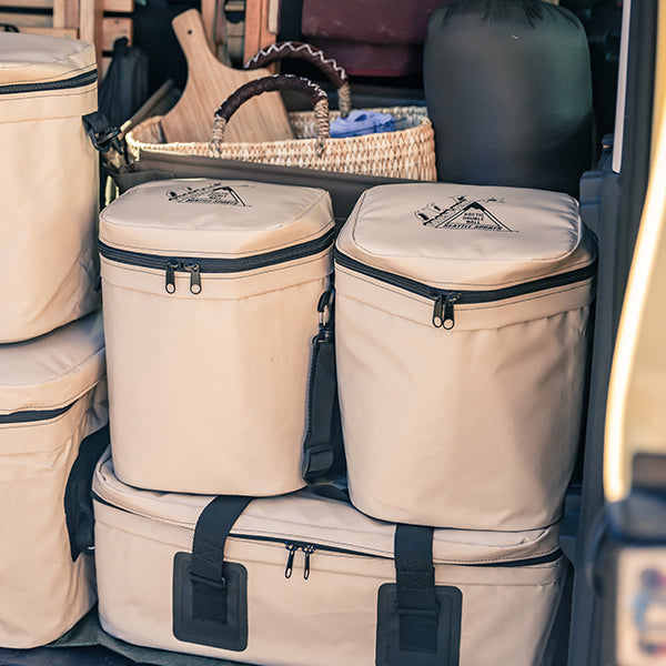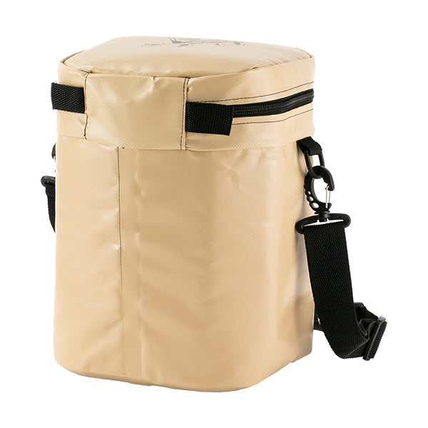 外側は19オンスのビニールを使用し、電磁波で溶着されています。12クォートと23クォートにはLOCOMODIVEシステムのストラップが付いているので、重量があっても安定して持ち運べ、取り外しや調整が可能です。ストラップはポリエステルなので、水分を含んでも機能が低下しません。収納時は折り畳んでコンパクトに出来るのもハードクーラーにはないソフトクーラーの魅力です。2Lのペットボトルを縦に収納可能です。