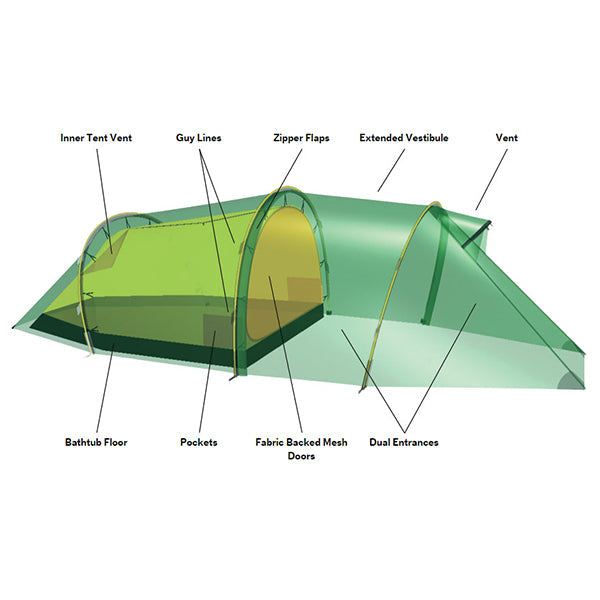 ・GTバージョンは入り口部分をのばし前室をさらに大型にすることにより、充分なギアストレージ/フリースペースを作り出しました。スペースを広くした分、ロングトリップに出たり、小さいお子様やペットのいる家族には最適なテントになります。