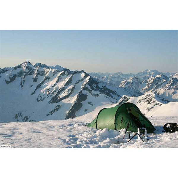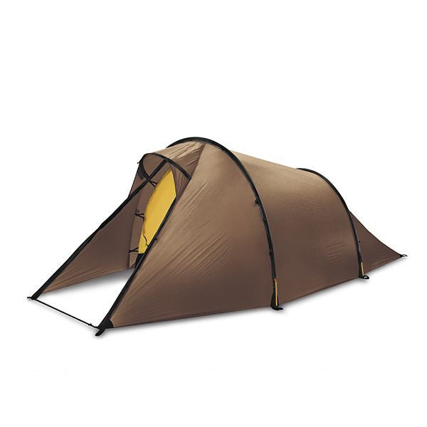 HILLEBERG ヒルバーグ ナロ3 サンドは一般テント素材の4倍もの引き裂き強度12kgを誇るKerlon1200を使い、2本ポールのWウエッジスタイルで荷物の置き場、悪天候時の調理スペースが充分確保されています。センターパネルに吸排気口がある他、前後方のドローコードを調節することで地面との空間により効率的な排気ができます。