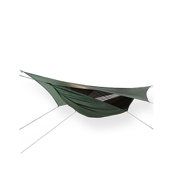 ハンモックと蚊帳、タープがひとつになったユニークなプロダクトです。ミニマリストのオーバーナイトにもお勧めです。テントのポールのように嵩張って重量の出るモノを持ち運ぶ必要はもうありません。軽量なハンモックを木に設置すれば本日の寝床があっという間に完成です。2本のメインロープを3.6m~6m離れた樹間に巻きつければ簡単に設営することができます。ハンモックだと腰が痛くならないの?と思われるかもしれませんが、特許取得済みの非対称形状の構造的なリッジラインによって、腰だけが落ち込まずにハンモック全体にテンションがかかり。身体全体をしっかりとサポートしながら快適に寝ることができます。ハンモックが細かい目のメッシュでおおわれていることで蚊帳となり、蚊などの害虫を防ぎ、ハンモック状に浮いていることで地面からの虫や蛇などの侵入の可能性を軽減します。ハンモックの蚊帳に入るには、ジッパー開閉式のサイドエントランスがハンモックの片側に設置されています。開いて寝たり、イス代わりに座ったりできます。身長の低いお子様でも使いやすいデザインになっています。フライシートが強い日差しから守ってくれ、メッシュの蚊帳は虫の侵入を防ぎます。寝心地は驚くほど快適で高品質のマットレスと同じ快適性をお約束します。木が無い場所でも、トレッキングポールがあれば、ビィビィサックとして使うことも可能です。