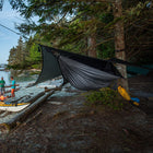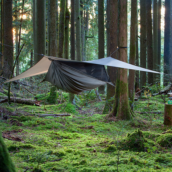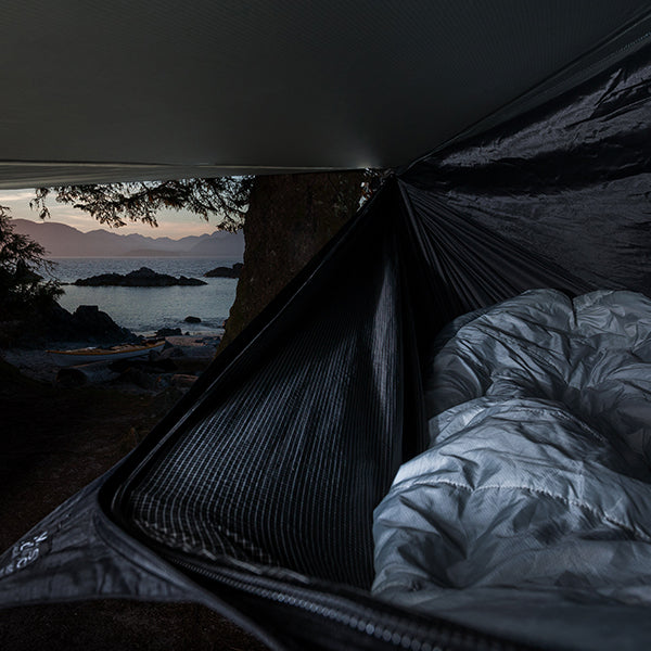 スルーハイカーや、バックパックのサイズ、重量を減らしたい方向けに開発されました。素材は20デニール シルナイロンフライ、30デニール スペクトラ強化底部ファブリック、(ハンモックを木に設置する)細くて強度の高いスペクトラ ロープを備えた当社で最も軽量でコンパクトなモデルです。テントのポールのように嵩張って重量の出るモノを持ち運ぶ必要はもうありません。軽量なハンモックを木に設置すれば本日の寝床があっという間に完成です。ハンモックだと腰が痛くならないの?と思われるかもしれませんが、特許取得済みの非対称形状の構造的なリッジラインによって、腰だけが落ち込まずにハンモック全体にテンションがかかり。身体全体をしっかりとサポートしながら快適に寝ることができます。ハンモックが細かい目のメッシュでおおわれていることで蚊帳となり、蚊などの害虫を防ぎ、ハンモック状に浮いていることで地面からの虫や蛇などの侵入の可能性を軽減します。ハンモックの蚊帳に入るには、ジッパー開閉式のサイドエントランスがハンモックの片側に設置されています。開いて寝たり、イス代わりに座ったりできます。身長の低いお子様でも使いやすいデザインになっています。