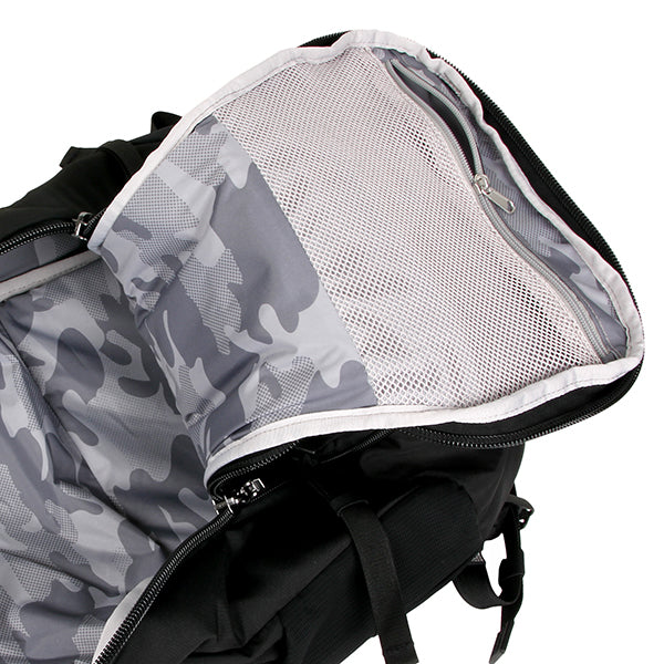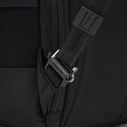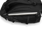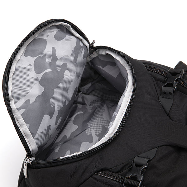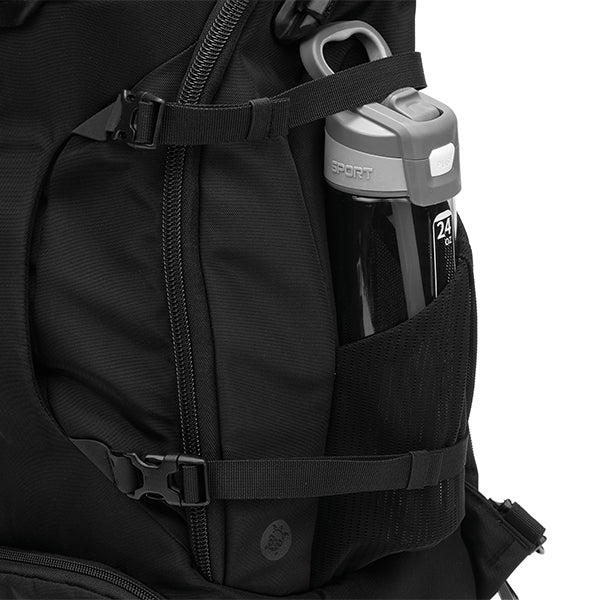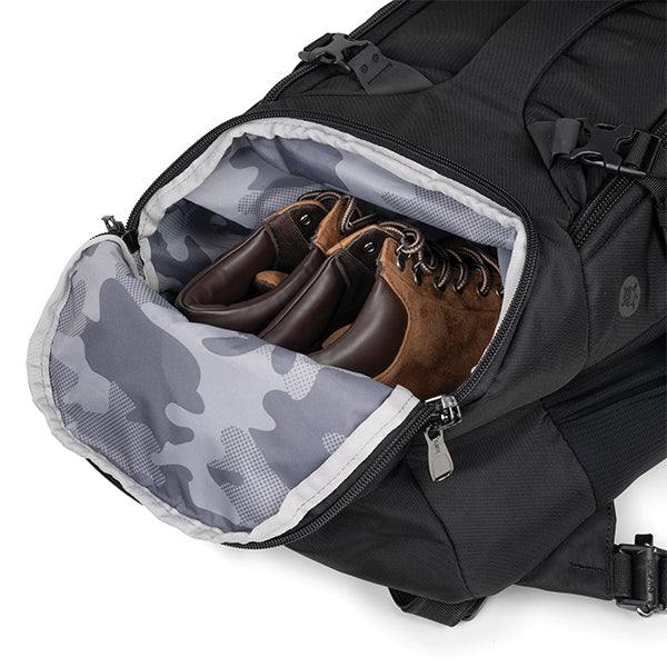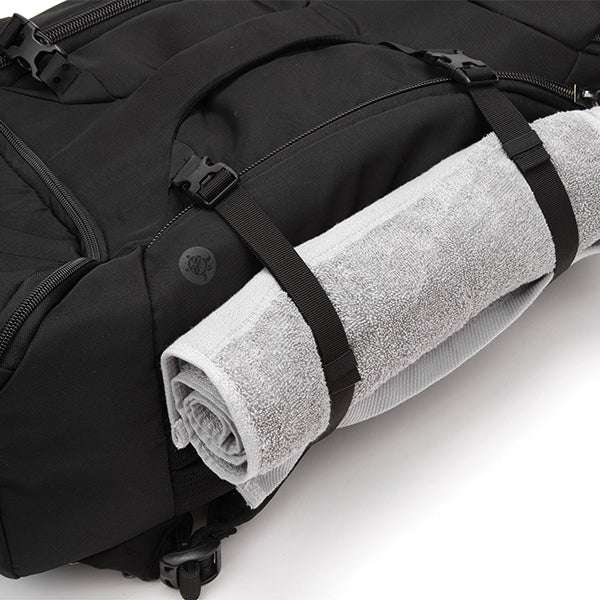 汚れた靴や濡れたタオルを分けて収納できるボトムコンパートメント、2つの大型ボトルポケット、ヨガマットやシェルジャケットを収納できる外部圧縮/取り付けストラップを装備しています。最新のPacsafe盗難防止技術であるセルフロッキングジッパーが搭載され、生地にはリサイクルペットボトルを使用しています。また、100%PFCフリーの撥水加工を施しています。