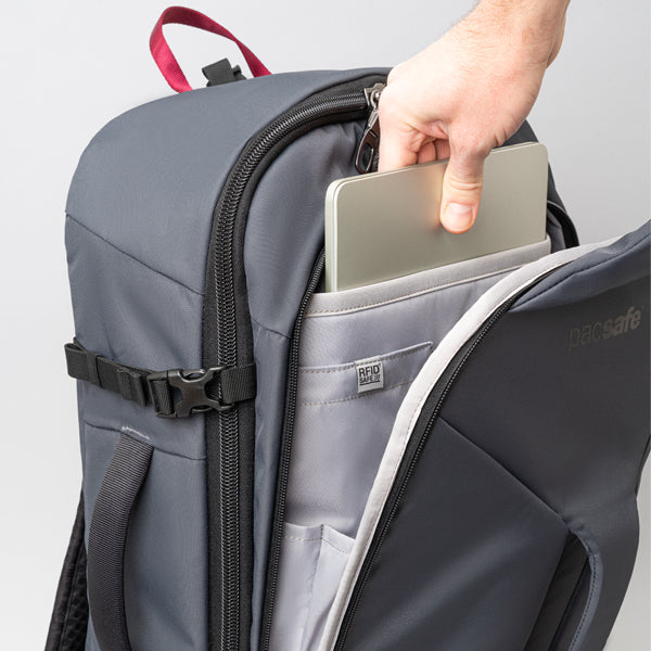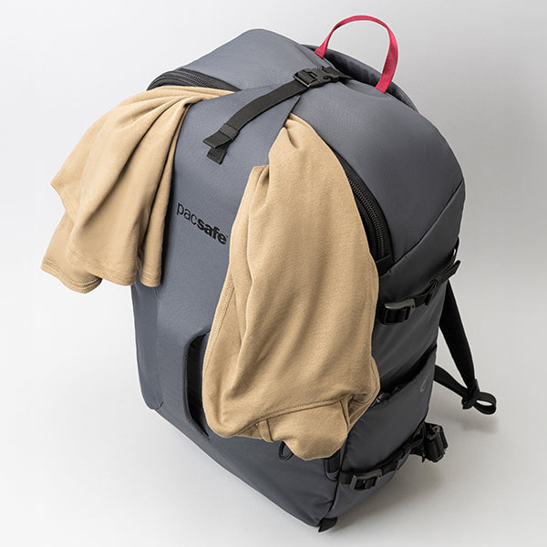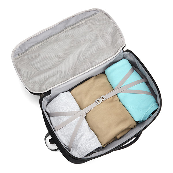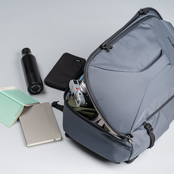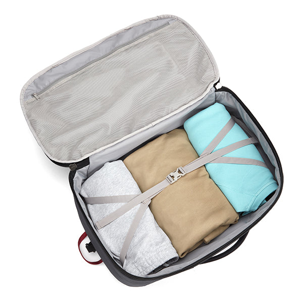 pacsafe パックセーフ EXP45 キャリーオントラベルパック は高い機能性とセキュリティ機能が詰まったトラベルパックです。ほとんどの主要航空会社の機内持ち込み制限に対応し、スーツケースの様に開くので必要な荷物の出し入れが容易にできます。