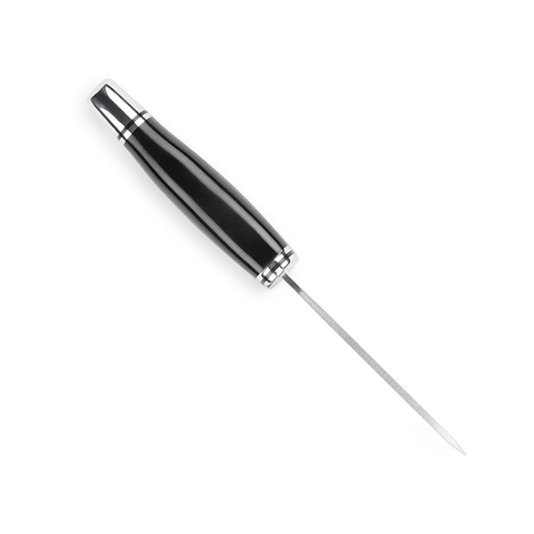 手の形にフィットするようにハンドルが形成されており、ブレードが先端に向かって平たく、幅広くなることによって広い範囲に一定の力が加えやすく、皮を剥ぎやすい形状となっております。またハンドル材には熱や衝撃に強い「フェロリック樹脂」を採用。バッドキャップ、ヒルト部分には熱処理をした「ジュラルミン」と「ファイバースペーサー」を使っていて、軽さと操作性のバランスをとても考えております。