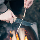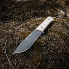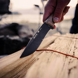 頑強な「5160スプリング鋼」の刃は粘りがあり、鋭い切れ味を確保できます。また鋼の弱点である腐食性をカバーする為、軍事利用もされている「セラコートコバルトコーティング」を施し、耐久性、耐摩耗性を向上させています。この素材は多くの溶剤、化学薬品にも耐性を持っています。ハンドルの「キャンバスマイカルタ」は積層綿布にフェノール樹脂をしみこませた素材で非常に高度があり、また湿気を吸いやすく乾きやすいので滑りにくく、重宝されるハンドル材となっております。