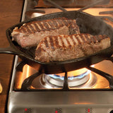 横幅26.6cmで、アメリカでも人気のサイズです。グリル:網焼きができるフライパンでステーキや野菜に綺麗な焼き目をつけることができます。ハンドル(柄の部分)の反対側にアシストハンドルがあり、両手で持ち上げることができ扱いやすいデザインです。スキレット全体が5mmの厚みで鉄の蓄熱力が高く、おいしく調理できます。
