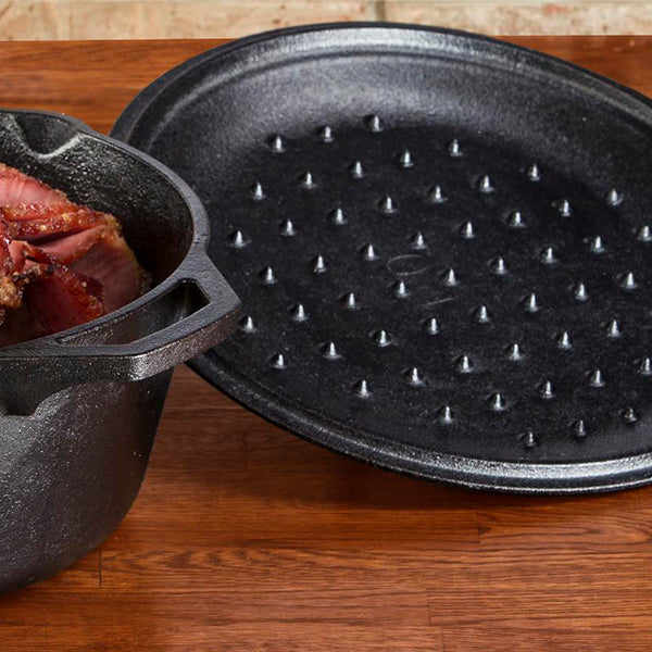 内径29.6cm、深さ12.3cmのサイズはキッチンでも使いやすいダッチオーブン特有の脚がないタイプです。蒸し鶏、大人数のカレー、揚げ物、炊飯などマルチに使えます。鍋全体が5mmの厚みで、鉄の蓄熱力を上げ、焼く、蒸す、炒める、煮るなど全ての調理法に適しています。付属の蓋がより調理の幅を広げ、性能を発揮します。