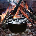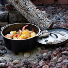ダッチオーブンとは脚がついたキャンプ用のお鍋の一般的な名称です。コンロでももちろん使っていただけますし、脚付きなので炭や薪を下に入れての調理も可能です。蓋には炭を載せて天火として使えるようにふちがついていて、ローストビーフ、ローストチキンなどが作れます。全体が5mmの厚みで、鉄の蓄熱力を上げ、焼く、蒸す、炒める、煮るなど全ての調理法に適していることから、キャンプに最もふさわしい調理器具と呼ばれています。ダッチオーブンが一台あればキャンプメニューのバリエーションは無限です。朝食にはパンを焼いたり、炊飯、肉、魚、野菜を蒸したりグリルしたり、ブイヤベース、カレー、ロールキャベツなど季節のおいしいお食事を楽しめます。
