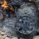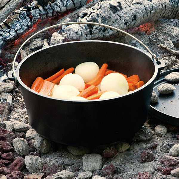 ダッチオーブンとは脚がついたキャンプ用のお鍋の一般的な名称です。コンロでももちろん使っていただけますし、脚付きなので炭や薪を下に入れての調理も可能です。蓋には炭を載せて天火として使えるようにふちがついていて、ローストビーフ、ローストチキンなどが作れます。全体が5mmの厚みで、鉄の蓄熱力を上げ、焼く、蒸す、炒める、煮るなど全ての調理法に適していることから、キャンプに最もふさわしい調理器具と呼ばれています。ダッチオーブンが一台あればキャンプメニューのバリエーションは無限です。朝食にはパンを焼いたり、炊飯、肉、魚、野菜を蒸したりグリルしたり、ブイヤベース、カレー、ロールキャベツなど季節のおいしいお食事を楽しめます。