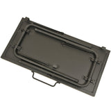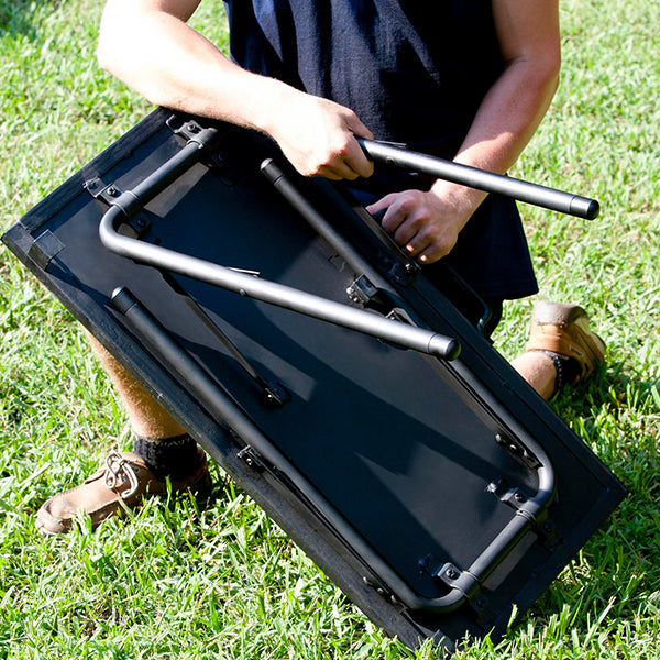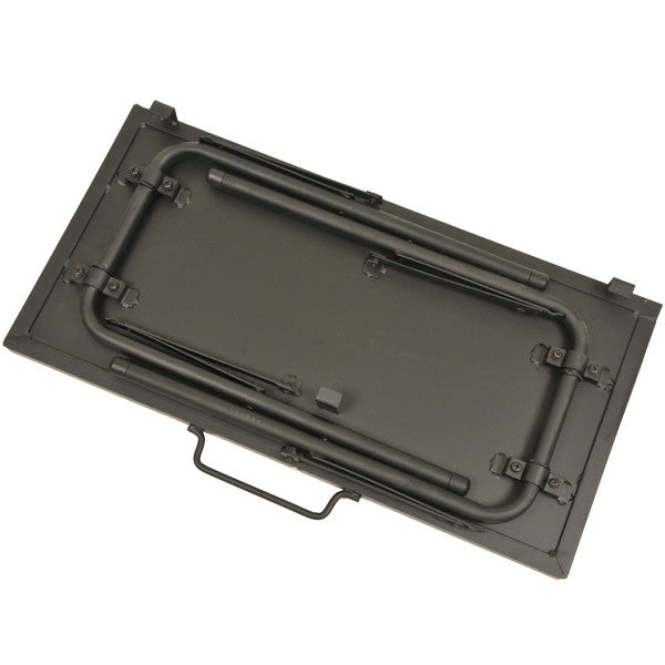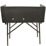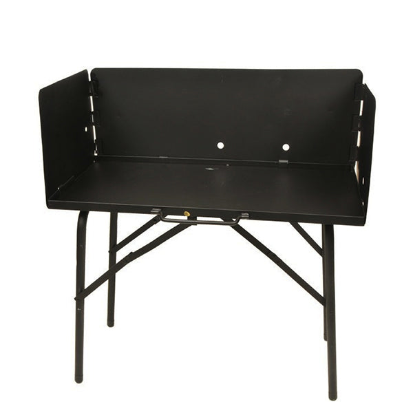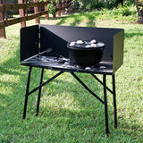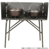 耐久性に優れたステンレスでできており、テーブルの上に炭を置き、コンロ代わりでダッチオーヴン料理や食材をのせたりするにもとても便利です。3方の風防と脚は折りたたんで簡単に収納できます。デッキ部は約3ミリの鉄板で炭の耐熱にも優れています。直火が出来ないキャンプ場では大いに力を発揮します。