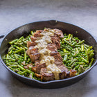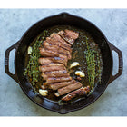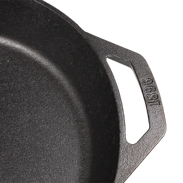 通常のスキレット(フライパン)より少し深さがあり、煮込み料理が得意です。オーブンを使った料理では長い持手が邪魔になることがありますが、こちらは両手で持てるループハンドルタイプで、ハンドルが邪魔にならず、日本のキッチンでも使用しやすいタイプです。鍋全体が5mmの厚みで、鉄の蓄熱力を上げ、焼く、蒸す、炒める、煮るなど全ての調理法に適しています。