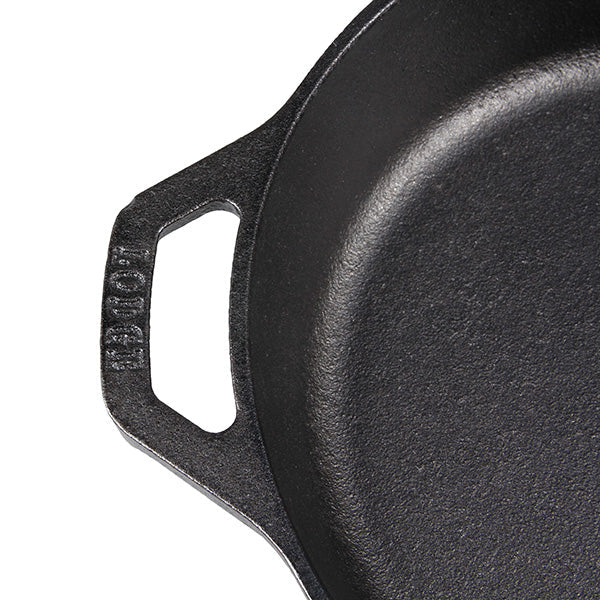 10-1/4インチ(内径25.7cm)で、アメリカでも人気のサイズです。大家族のステーキを一気に焼いたり、煮込み料理にもお勧めです。ハンドル(柄の部分)の反対側にアシストハンドルがあり、両手で持ち上げることができ扱いやすいデザインです。スキレット全体が5mmの厚みで、鉄の蓄熱力を上げ、焼く、蒸す、炒める、煮るなど全ての調理法に適しています。スキレットの調理はスキレットカバー(別売りの蓋)があるとより調理の幅を広げ、性能を発揮します。