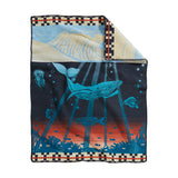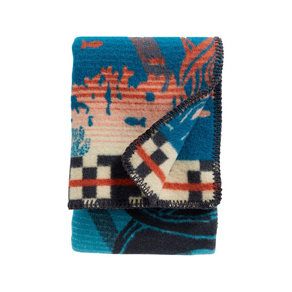美しい海をモチーフにした優しい色合いのブランケット、まず目を惹かれるのは、優雅に泳ぐシロナガスクジラのシルエットです。でもよーく、海の中を覗いてみると、クラゲに、タツノオトシゴ、ユニークな魚がいきいきと泳いでいます。海上は気持ちの良いウェーブ、海底にはコーラルカラーで表現されたサンゴの森と小魚の群れが描かれています。それぞれの生き物がお互いを気遣い、コミュニケーションをとって、気持ちの良い暮らし方をしている、そんなことを思わされる清々しいブランケットです。