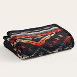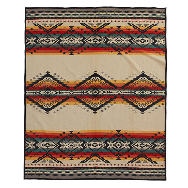 ブランケットに描かれた菱形とジグザグの層が、現在ではジョンデイ化石層やペインテッド・ヒルズへの旅行者を迎えているこの地域のドラマチックな地質のカラフルで複雑な丘を表現しています。