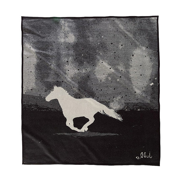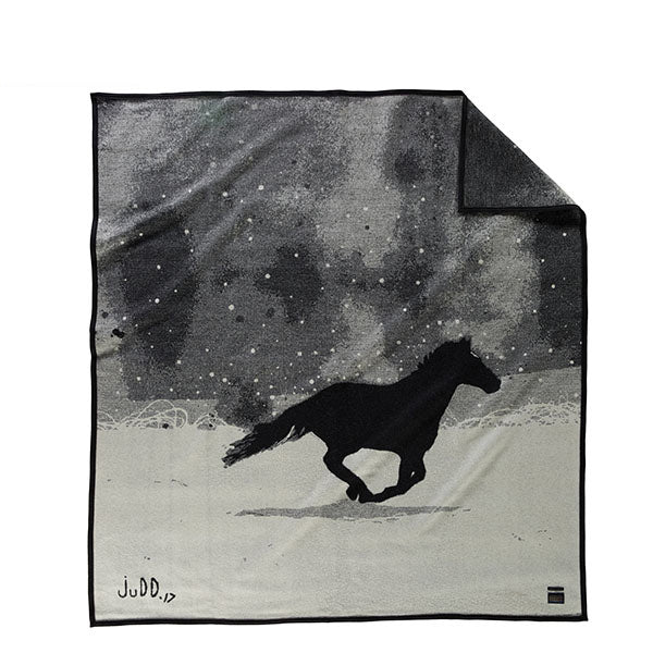 モンタナ出身のアーティスト、ジャド・トンプソンが描いたアートがウールブランケットに命を吹き込みました。雪原を駆ける馬のシルエットなど、夢のようなシーンを描いたオリジナルデザインです。ソファに掛けても、壁に飾っても、インテリアとして存在感充分な1枚です。