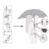 付属の2つのクリップをショルダーハーネスとウエストベルトにベロクロテープで固定し、傘を風と雨の方向に応じて右または左に固定することができます。