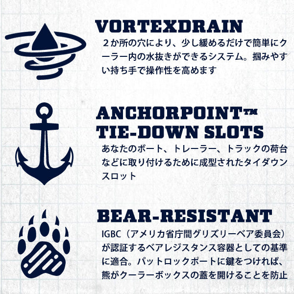 少人数のキャンプで食料を持ち運ぶには最適なサイズです。一般的なクーラーボックスとは違い、激流に耐えるホワイトウォーターカヤックと同じロテーショナルモールド(回転成形工法)を採用したワンピース構造です。蓋、ボディ共に継ぎ目無くモールドされ、耐衝撃性と、長期使用においての耐久性に優れています。一般的なクーラーボックスはインシュレーションとボディの外壁が接着剤で接合されているモデルが多く、時間が経つにつれ接着剤の劣化による剥離やつなぎのパーツが破損してしまう事があります。YETIクーラーは圧力注入された分厚い5cmのインシュレーションと密閉性の高いシステムにより保冷力を高め、他社製品を寄せ付けない高い性能を発揮します。