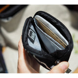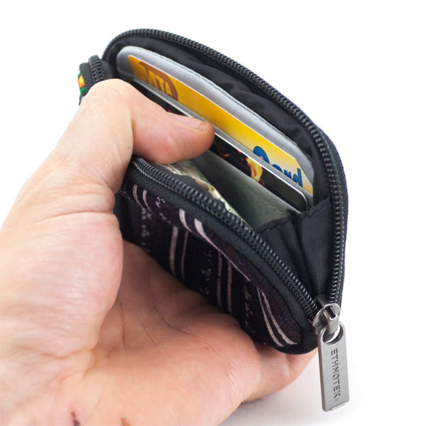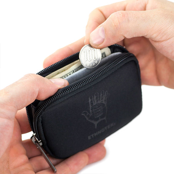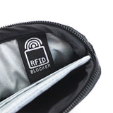 仕切りにはカードが計3枚、加えて前後にスペースがあり、真ん中の仕切りを境にお札と小銭も少量入るためお財布としてもお使いいただけます。RFIDブロッカー素材を使用している為、スキミングの被害からも個人情報を守ることが出来ます。