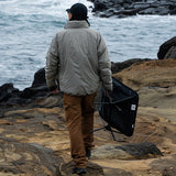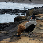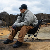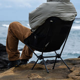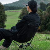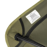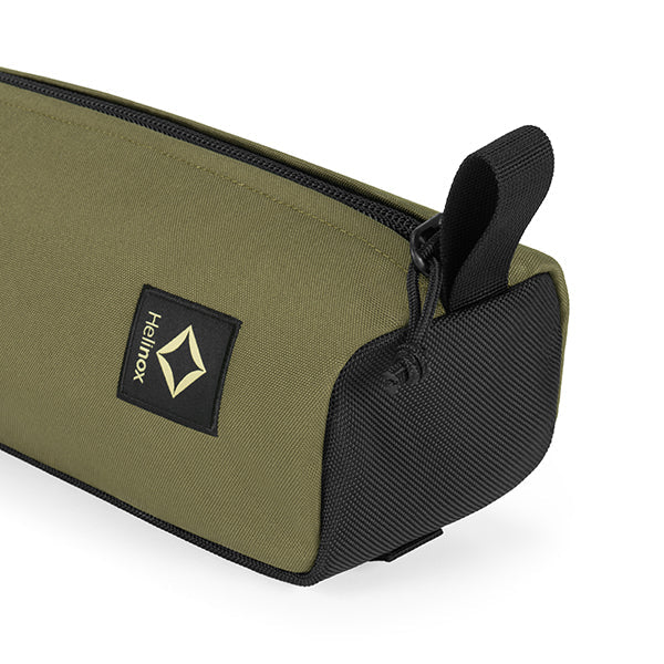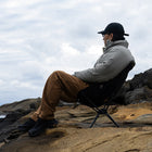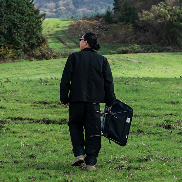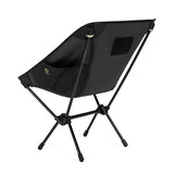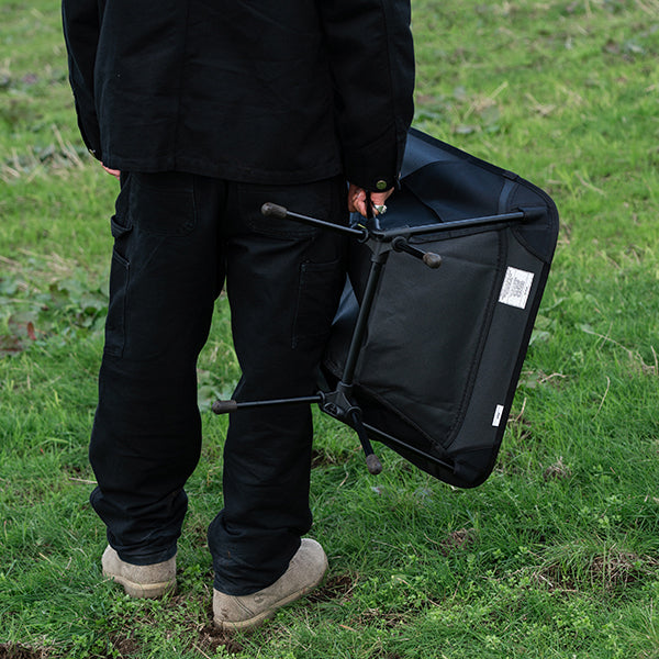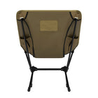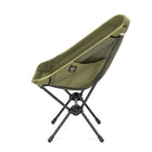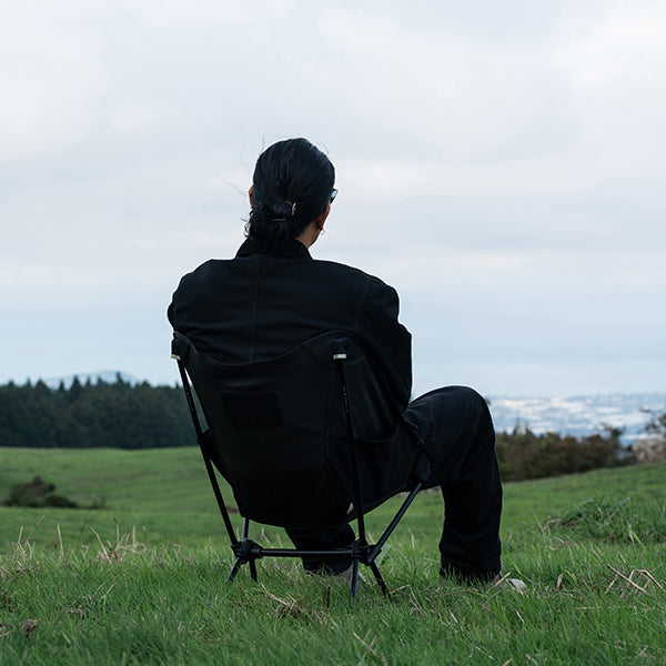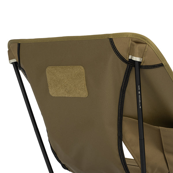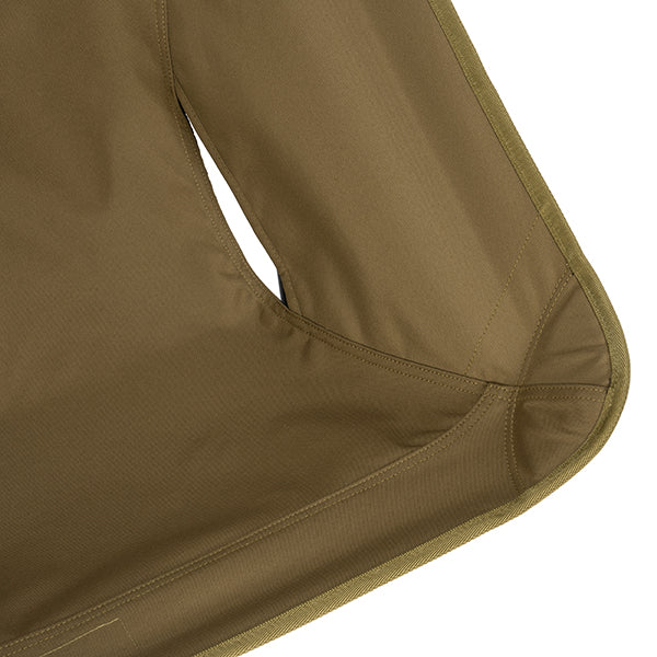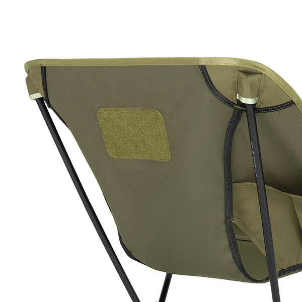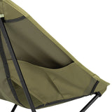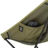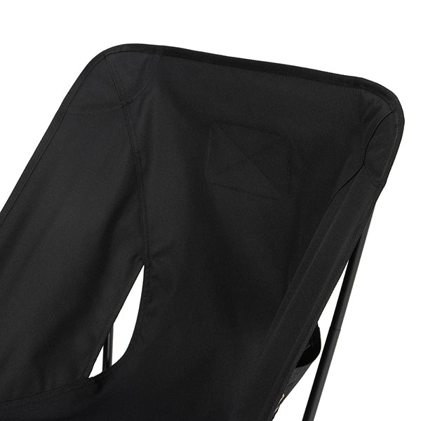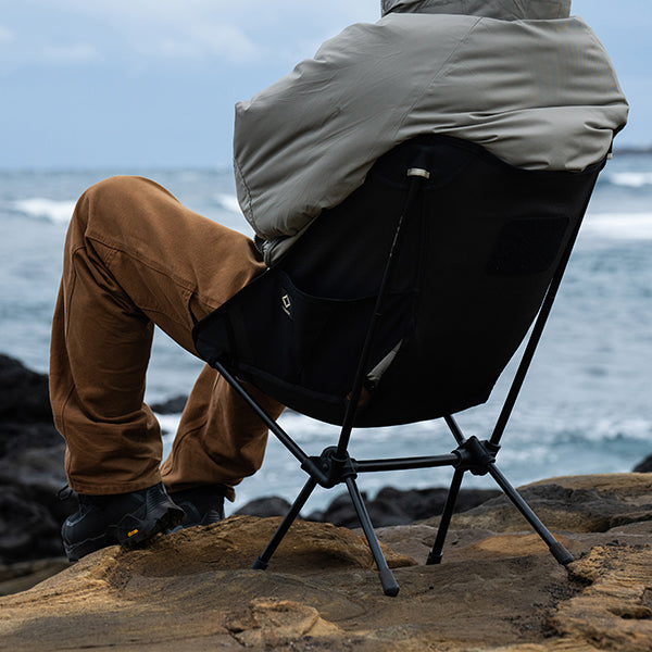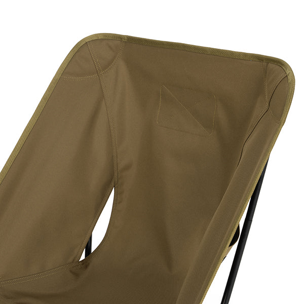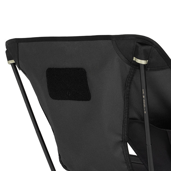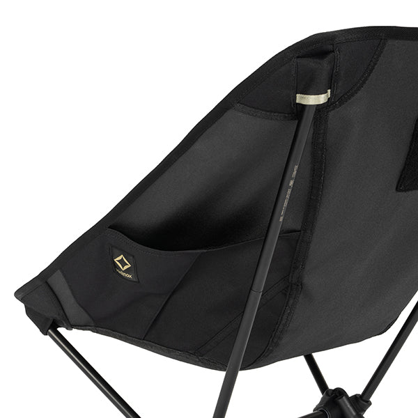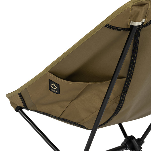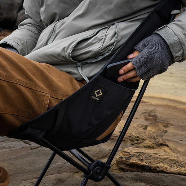 ヘリノックスのチェアは持ち運びに便利なコンパクトさが特徴のひとつ。故に、無駄を削いだデザインの中で座り心地の快適性を追求しています。袋から取り出して、脚部分を組み立てて座面のシートを取り付ければ、直ぐに座れる手軽な折りたたみ式です。ミリタリーラインならではの無骨ながらも洗練されたデザインが特徴で、カラーリングや各部のディティールにこだわりが盛り込まれています。ジッパー付きのポリエステル生地の収納袋は、フレームに付けることで小物を入れることができるポケットにもなります。また、両サイドのカーゴポケットには携帯電話や小物等を収納可能です。背面にはベルクロが付いているので、ワッペンや夜間視認性を上げるための反射板などを付けてカスタマイズすることも可能です。
