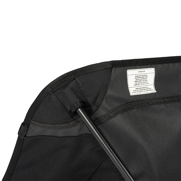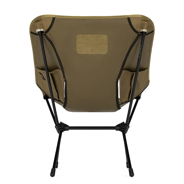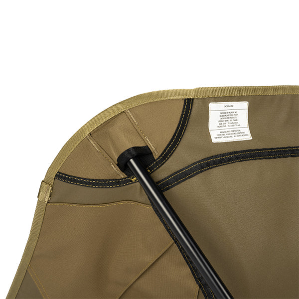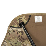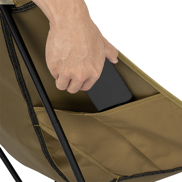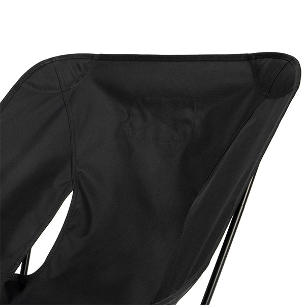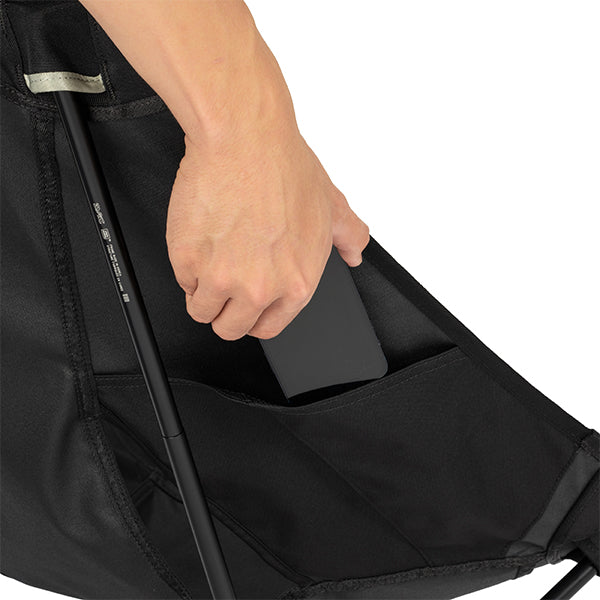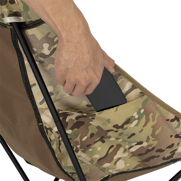 座面高さはタクティカルチェアとほぼ変わらず、シート部分を広くしました。座った時のお尻の窮屈さを軽減し、子どもから大人まで幅広い体格の方にお使いいただけます。タクティカルラインならではの、必要最低限に削ぎ落とされた装飾とシンプルなデザイン。その徹底した機能美こそが無骨さの魅力です。袋から取り出して、脚部分を組み立てて座面のシートを取り付ければ、直ぐに座れる手軽な折りたたみ式で、シンプルなデザインでありながらジッパー付きのポリエステル生地の収納袋をフレームに付けることで小物を入れることができ、さらに両サイドにあるカーゴポケットには携帯電話や小物等を収納可能です。背面にはベルクロが付いているので、ワッペンや夜間視認性を上げるための反射板などを付けてオリジナルなチェアにカスタマイズすることも可能です。