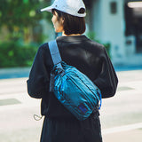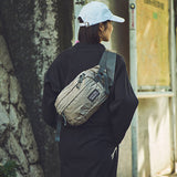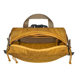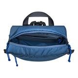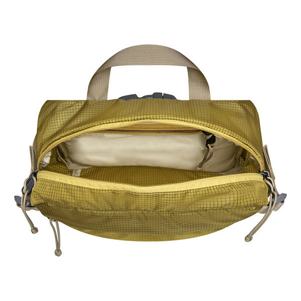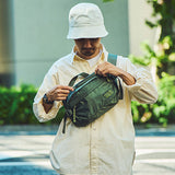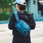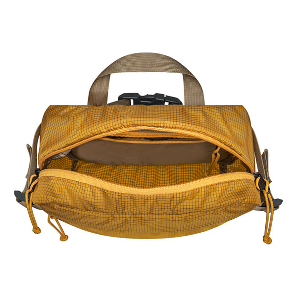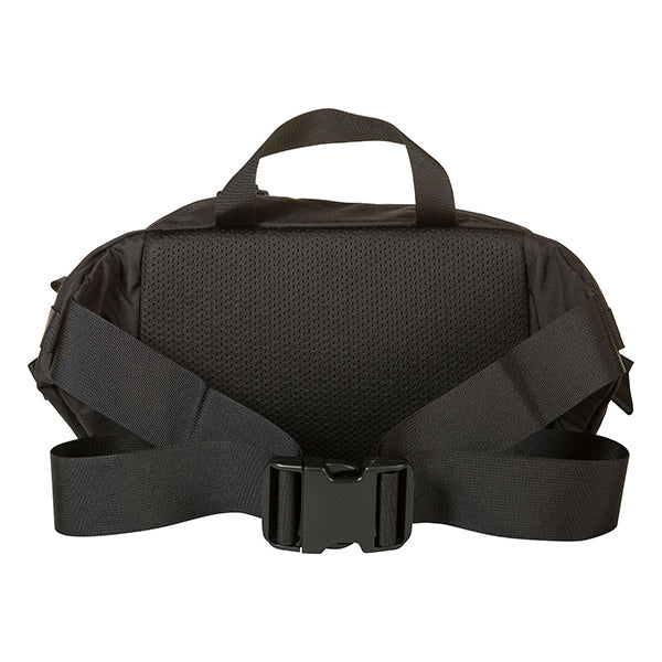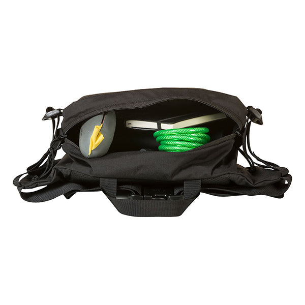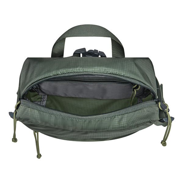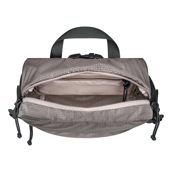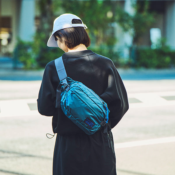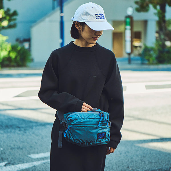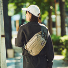 パック側面から付いたコンプレッションストラップはウェビングと本体をつなぐウィングパーツごと体に密着させる事が可能で、驚くほどに身体にフィットします。この構造によりランニングやバイクライド中でもバッグが暴れません。正面と内側にジッパーポケットが備わっています。パック上部にはハンドルがある為、手持ちバッグとしても使用可能です。