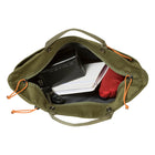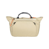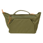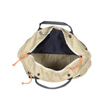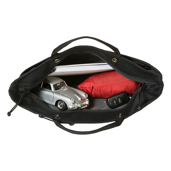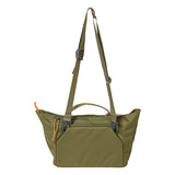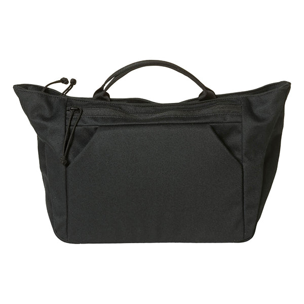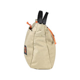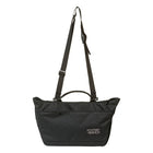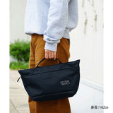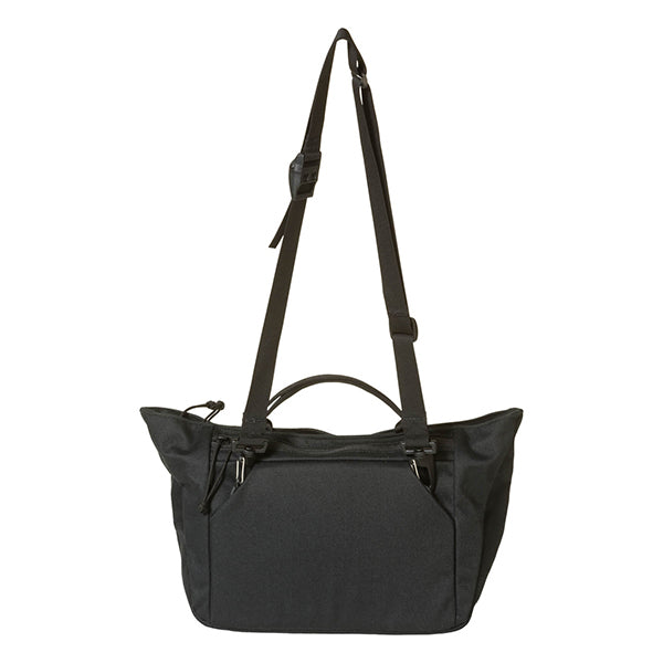 正面の大きなポケットに加え背面にも小さなポケットがあり小物を仕分けて収納する事ができます。ジッパー付きのメインコンパートメント内部には耐水性のあるナイロンのライナーが付いています。着脱可能なショルダーストラップが付属し、手提げ肩掛けの2通りの使い方が可能です。ショルダーストラップは片手で長さ調整できる便利な構造です。