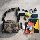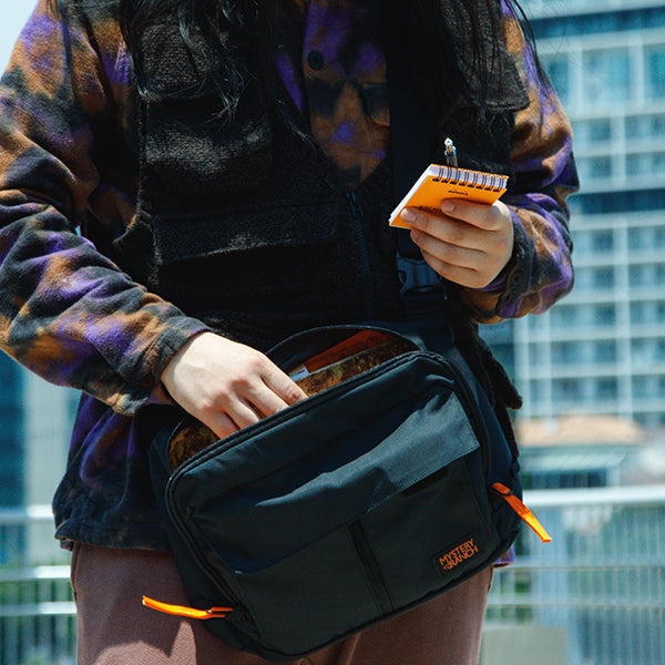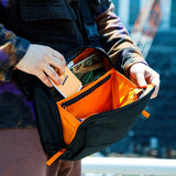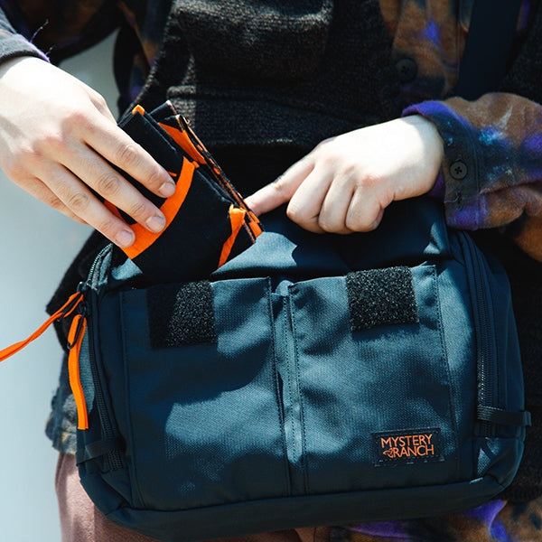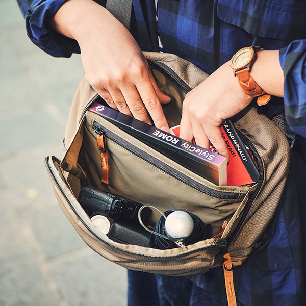 ベルクロで開閉できるフロントのアコーディオンポケットを2つ備え多くのアイテムを収納可能で、必需品を入れておくのに最適。背面には取り出しやすい、スリットポケットにタブレットなどを収納可能です。ジッパーの端に配置されたループにジッパープルを通すことによりちょっとした防犯になったり、サングラスなどを一時的にかけることができます。