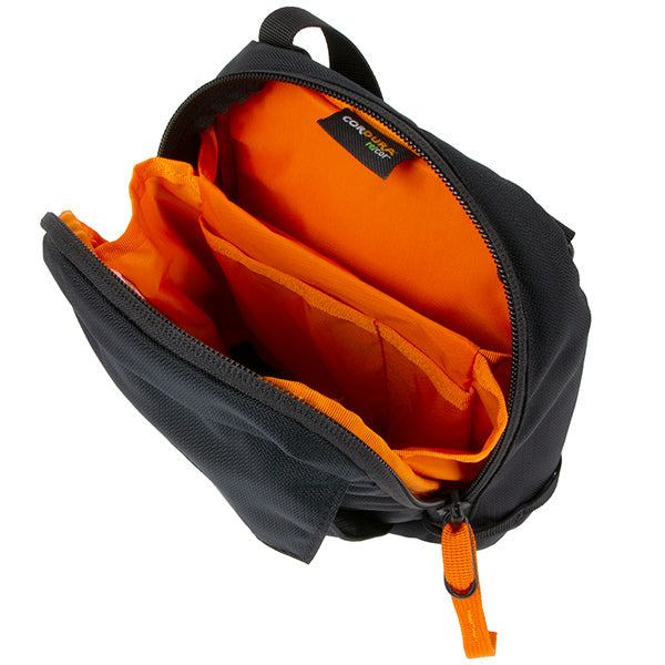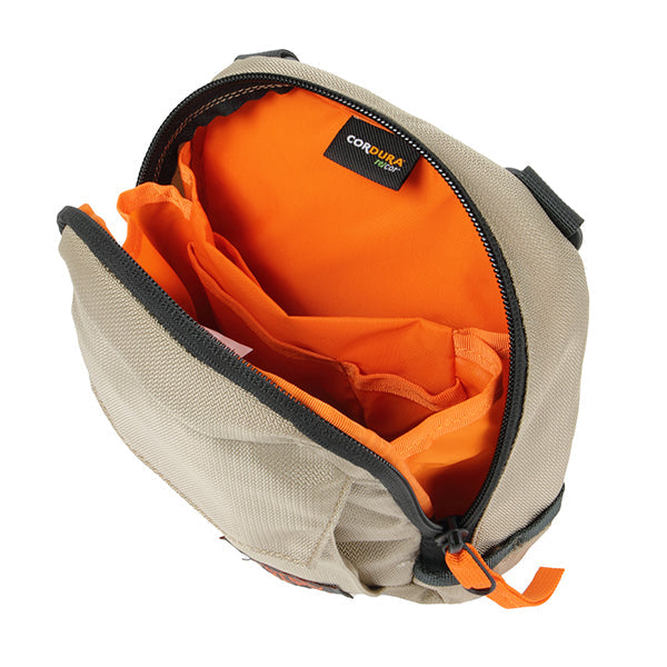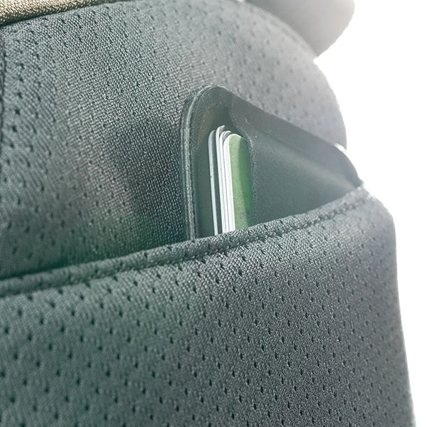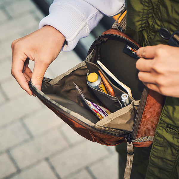 ベルクロで開閉できるフロントのアコーディオンポケットは、取り出しやすいキーチェーン付きで、必需品を入れておくのに最適。背面のポケットにはスマートフォンを入れるのがお勧めです。取り出しやすく、バイブレーションの振動にも気づきやすいスリットポケットです。ジッパーの端に配置されたループにジッパープルを通すことによりちょっとした防犯になったり、サングラスなどを一時的にかけることができます。