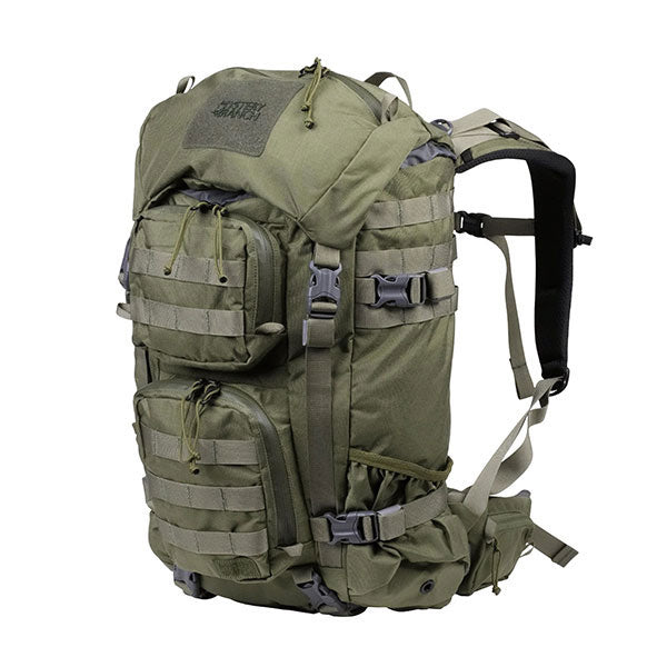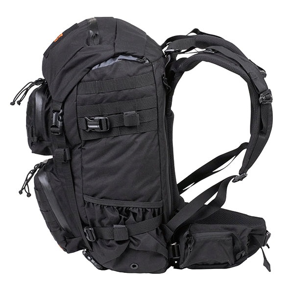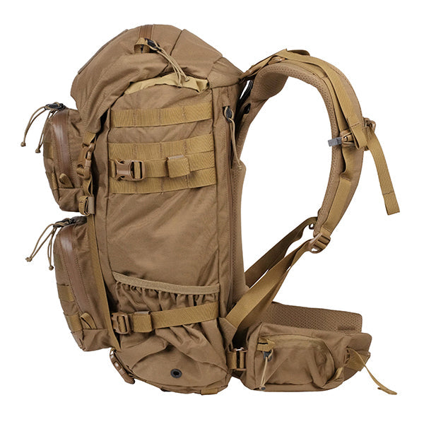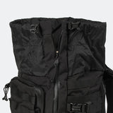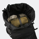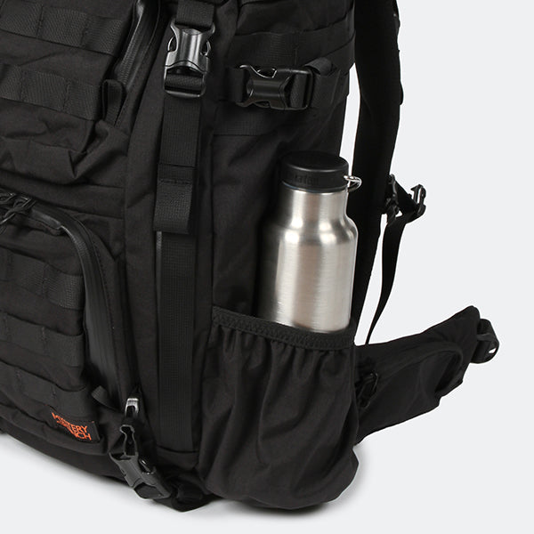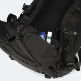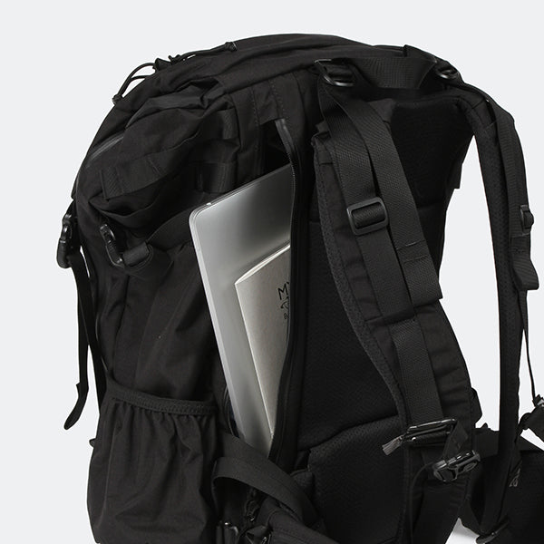 ラップトップPCスリーブはハイドレーションポケットともなり、トップとサイドからのアクセスが可能。ボディパネルのサイドジッパーから、スリーブにダイレクトにアクセスすれば、スムースにPCを取り出すことができます。荷物の詰まったバックパックからさっとPCを取り出して、少しだけワークしたい時には驚くほどに快適なサイドアクセスです。両サイドのボトルポケットにはボトム部分にグロメットで穴が開いているため、ボトルや折り畳み傘など濡れたものを入れた際にも水の抜ける仕様です。サイドコンプレッションはパックの内容量によりタイトにしたり緩めたりすることでパック全体をコンプレッションし、安定して運搬できます。両サイドと正面に配置したMOLLシステムにお好みのアクセサリー(別売)をつけてカスタムすれば、容量を増やしたり、特別な必需品をわかりやすく収納できます。外側の縦型にデザインされた3つのポケットは、1番上にはメッシュの裏地の少しフラットなポケット、真ん中は2つのディバイダーとキークリップ、一番下は複数のディバイダーとゴムバンドで縦長のものを挟むことができます。この3つのポケットの裏側にも1つ縦型のフラットなポケットがあります。35Lを持ち運ぶにふさわしい、パット付きのウェストベルトは、取り外すことも可能です。荷物が少ないときは取り外して、重たいときにはしっかりサポートしてくれます。
