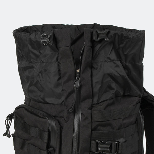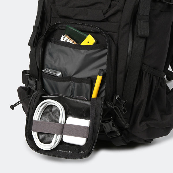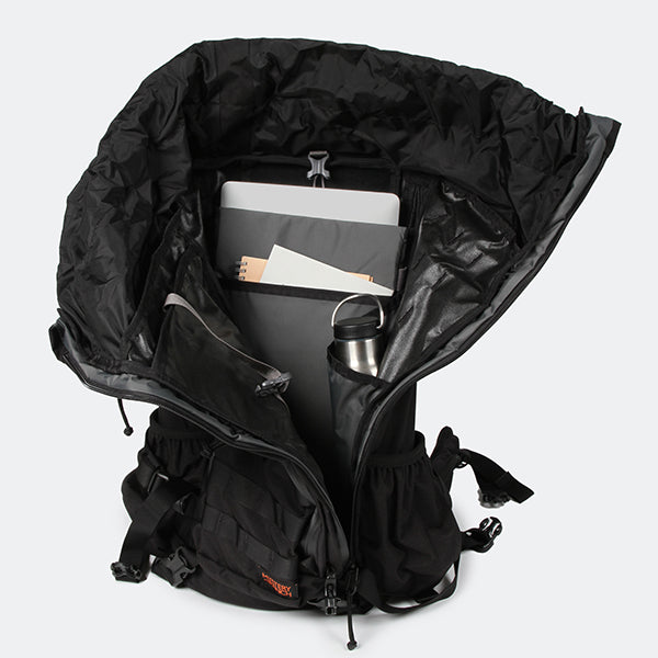 メインコンパートメントにはトップリッドを外し、シュラウドを開けてアクセスします。シュラウド上部にはバックル、サイドジッパーがありますのでここを開口することで、大きく開き荷物の出し入れ、整理整頓が非常に行いやすくなっています。パッド入りのラップトップPCスリーブは、ボトムから少し底上げされているので、パックを置いた際に衝撃がダイレクトに伝わらない設計です。本やタブレットを入れるドキュメントスリーブ、両サイドには縦型のポケットを配置し、ウォータボトル、折り畳み傘、小ぶりな三脚などをスマートに収納することができます。