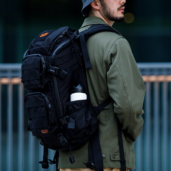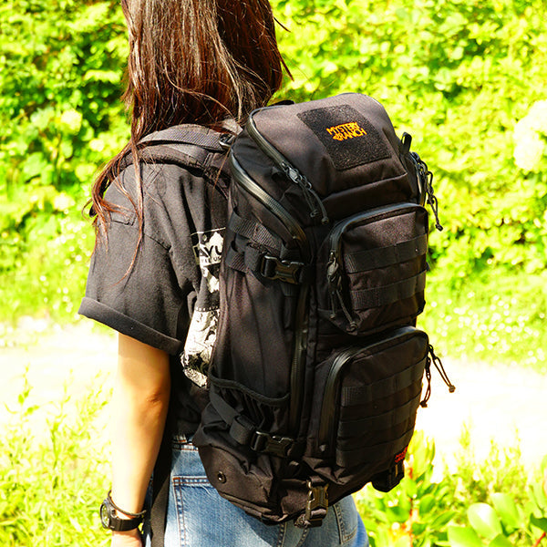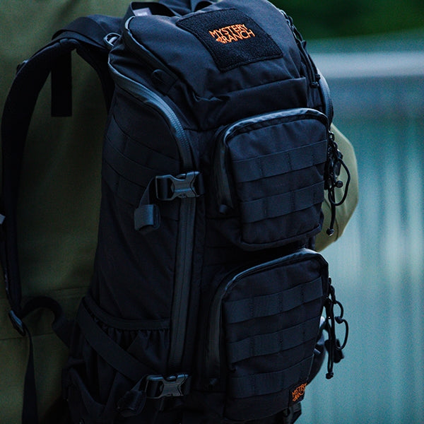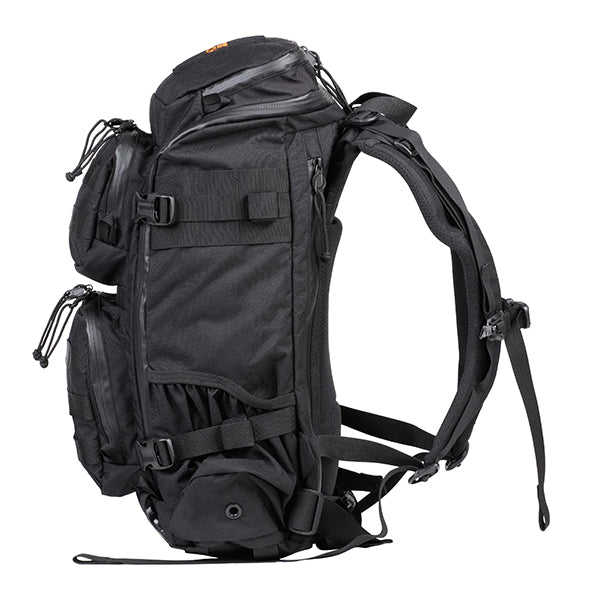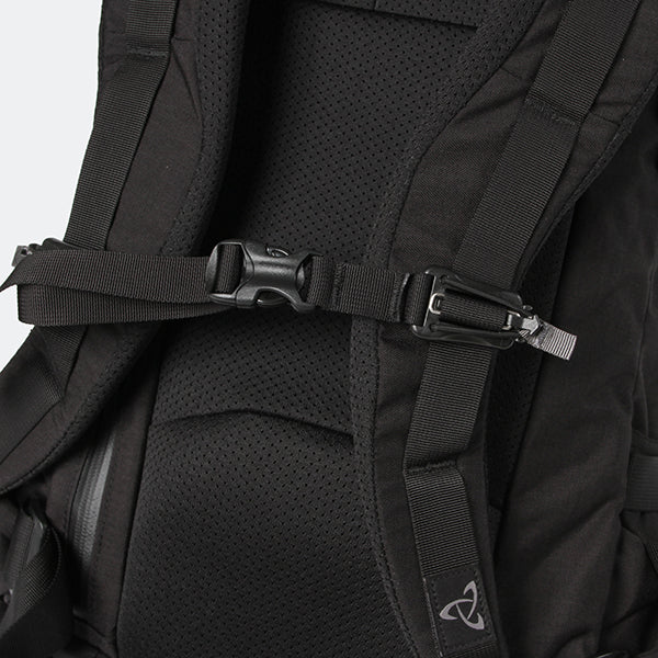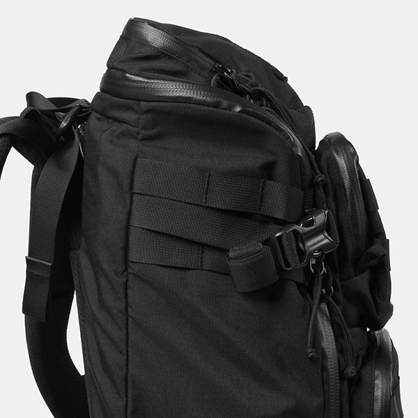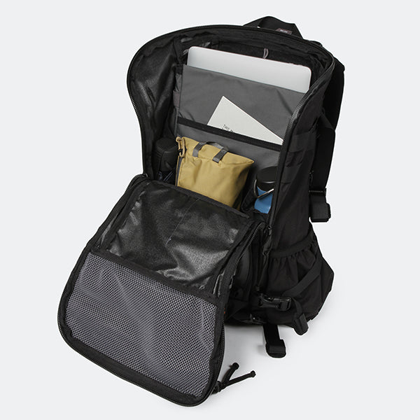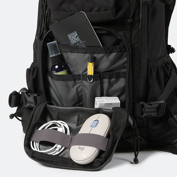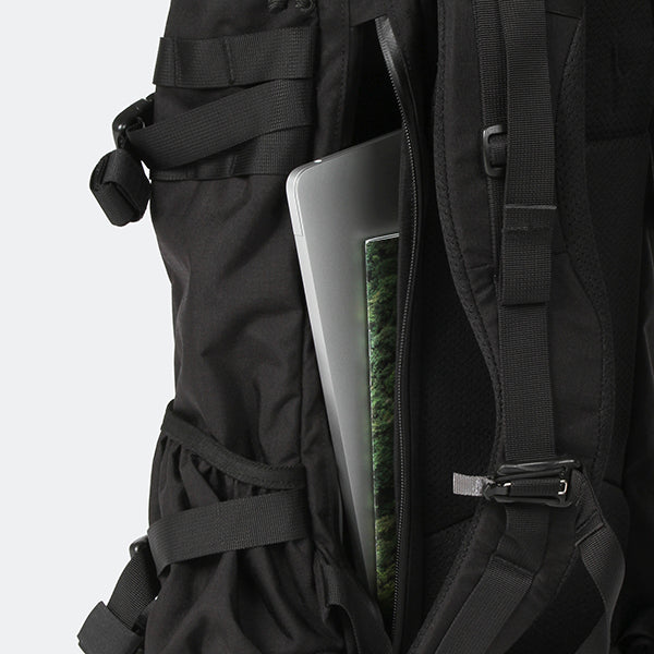 ラップトップPCスリーブはハイドレーションポケットともなり、トップとサイドからのアクセスが可能。ボディパネルのサイドジッパーから、スリーブにダイレクトにアクセスすれば、スムースにPCを取り出すことができます。荷物の詰まったバックパックからさっとPCを取り出して、少しだけワークしたい時には驚くほどに快適なサイドアクセスです。両サイドのボトルポケットにはボトム部分にグロメットで穴が開いているため、ボトルや折り畳み傘など濡れたものを入れた際にも水の抜ける仕様です。サイドコンプレッションはパックの内容量によりタイトにしたり緩めたりすることでパック全体をコンプレッションし、安定して運搬できます。両サイドと正面に配置したMOLLシステムにお好みのアクセサリー(別売)をつけてカスタムすれば、容量を増やしたり、特別な必需品をわかりやすく収納できます。外側の縦型にデザインされた3つのポケットは、1番上にはメッシュの裏地の少しフラットなポケット、真ん中は2つのディバイダーとキークリップ、一番下は複数のディバイダーとゴムバンドで縦長のものを挟むことができます。