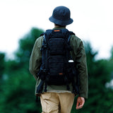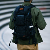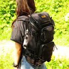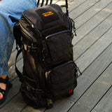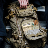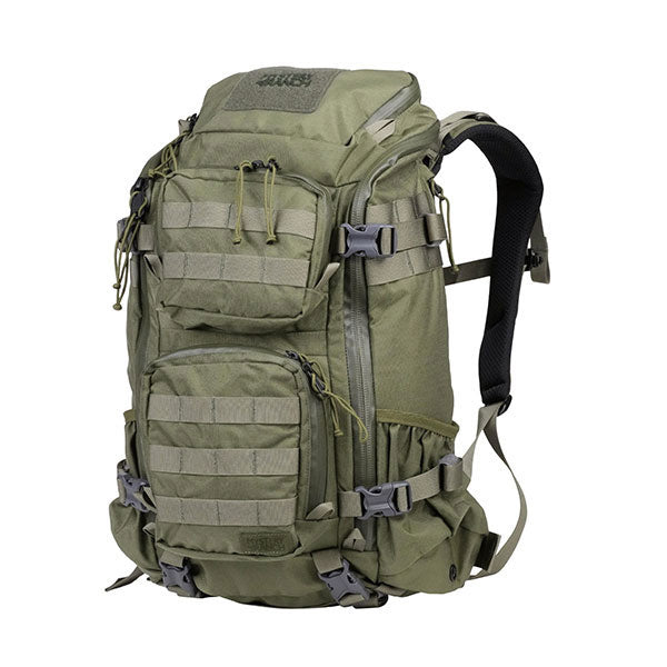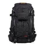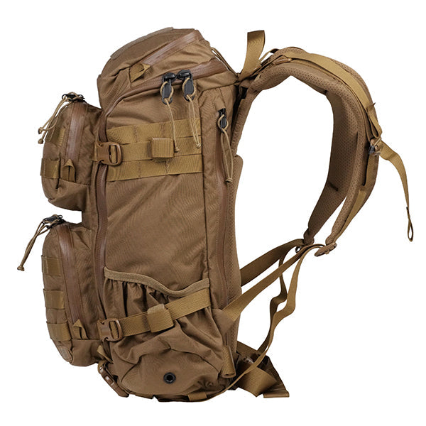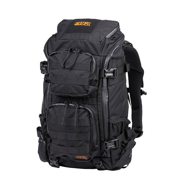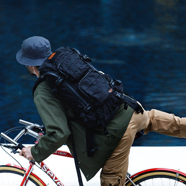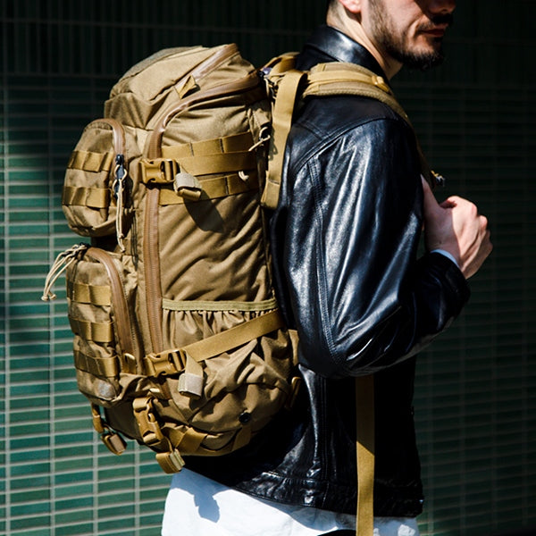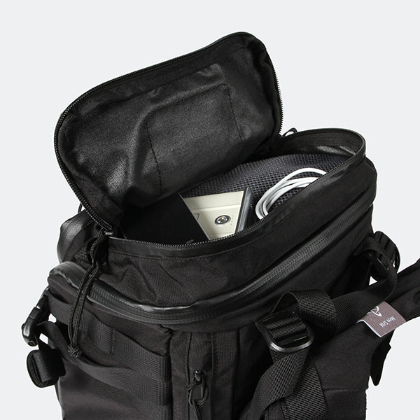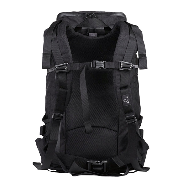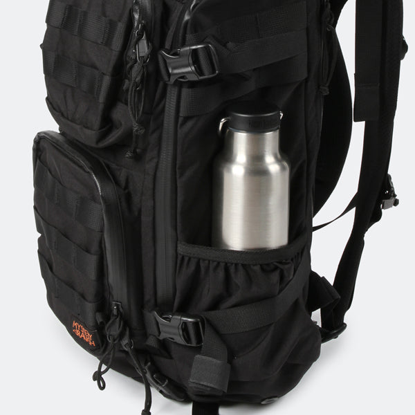 ラップトップPCスリーブはハイドレーションポケットともなり、トップとサイドからのアクセスが可能。ボディパネルのサイドジッパーから、スリーブにダイレクトにアクセスすれば、スムースにPCを取り出すことができます。荷物の詰まったバックパックからさっとPCを取り出して、少しだけワークしたい時には驚くほどに快適なサイドアクセスです。両サイドのボトルポケットにはボトム部分にグロメットで穴が開いているため、ボトルや折り畳み傘など濡れたものを入れた際にも水の抜ける仕様です。サイドコンプレッションはパックの内容量によりタイトにしたり緩めたりすることでパック全体をコンプレッションし、安定して運搬できます。両サイドと正面に配置したMOLLシステムにお好みのアクセサリー(別売)をつけてカスタムすれば、容量を増やしたり、特別な必需品をわかりやすく収納できます。外側の縦型にデザインされた3つのポケットは、1番上にはメッシュの裏地の少しフラットなポケット、真ん中は2つのディバイダーとキークリップ、一番下は複数のディバイダーとゴムバンドで縦長のものを挟むことができます。