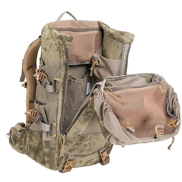 アクセスは用途により、チョイスできます。ハーネス(背面)側のバックルを外しトップリッドを開口します。トップリッドにはツリーハウスの用途に必須なツリースタンドにかけられるGフック、悪天候には簡易的にリッドをかぶせて固定しておけるGフック用のスリーブも装備しています。バックパックを開けたら、フロントのコンプレッションストラップのバックルを外し、両サイドのジッパーを下げて開ければ、メインコンパートメントにアクセスできます。このパックの特性上、開きすぎないデザインに設計をしており、中身がこぼれ落ちることはありません。インテリアはスクエアなシルエットで、ギアや着替えを入れるのに十分なスペースです。サイドにある2つのポケットはレンジファインダーなどの収納に最適、柔らかい生地が使われています。上部にメッシュポケット、ハイドレーションも対応した構造になっています。す。ハンティングだけでなく望遠レンズを使う写真愛好家の方にもおすすめです。