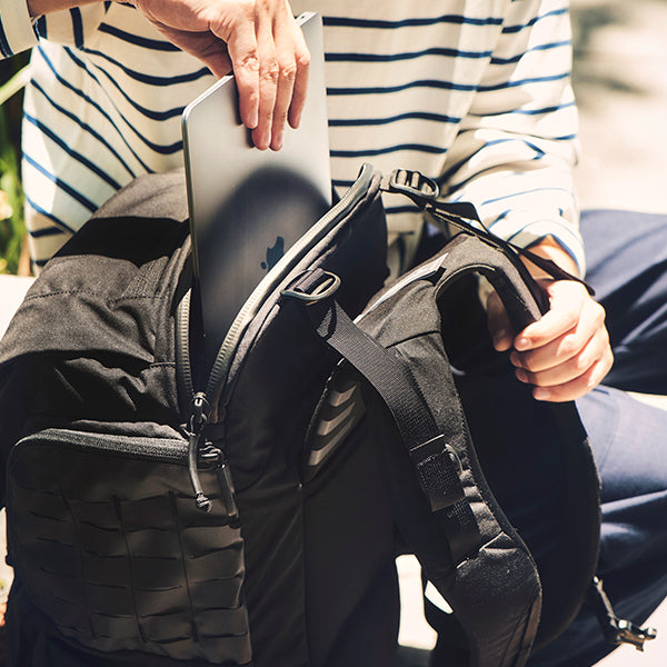 ・フローティングスリーブ|ラップトップスリーブがバックパックの底部分から少し底上げされた位置に設計されており、バックパックを置いた際の電子機器への衝撃を軽減