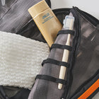 ・ラージサイズのポケットには、ヘアブラシやカミソリ、メイクブラシなどを収納できる、小さめのジッパーポケットとゴムループ付き