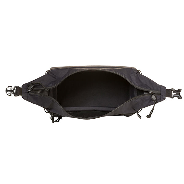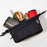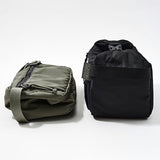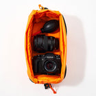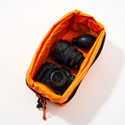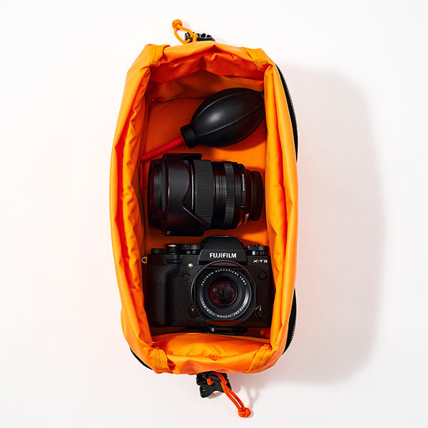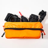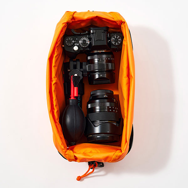 5面に衝撃を吸収するパッドが入ったパデットギアケース。開閉はトップに長くデザインされたジッパーとバックルで行います。ミラーレス一眼とレンズの収納にもピッタリで、外側には薄いポケットが付いているので小物収納にぴったりです。使わない時はフラットに折りたたむことができます。