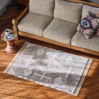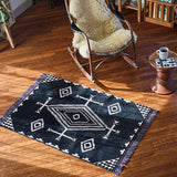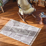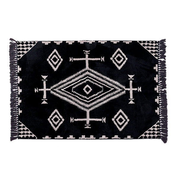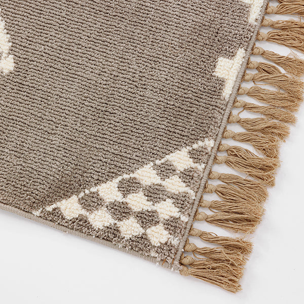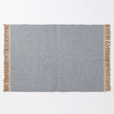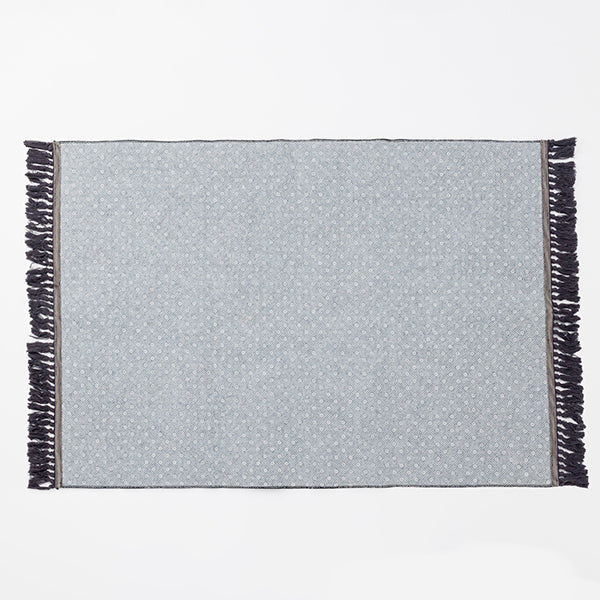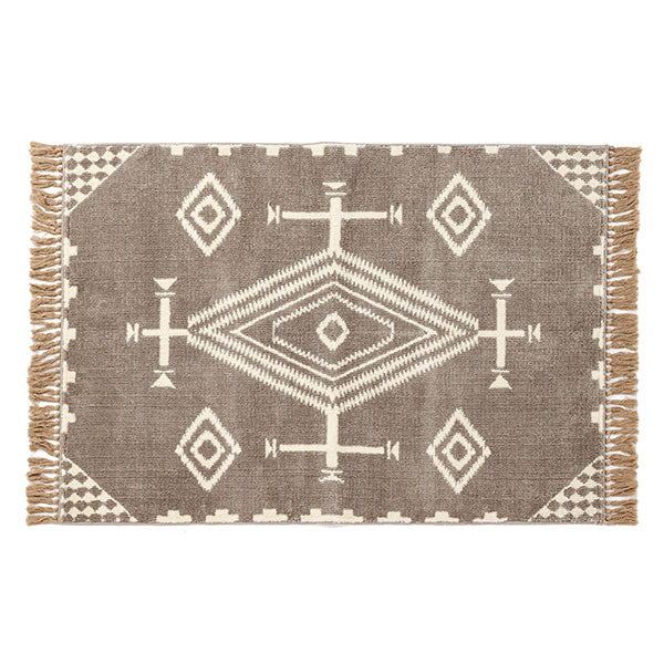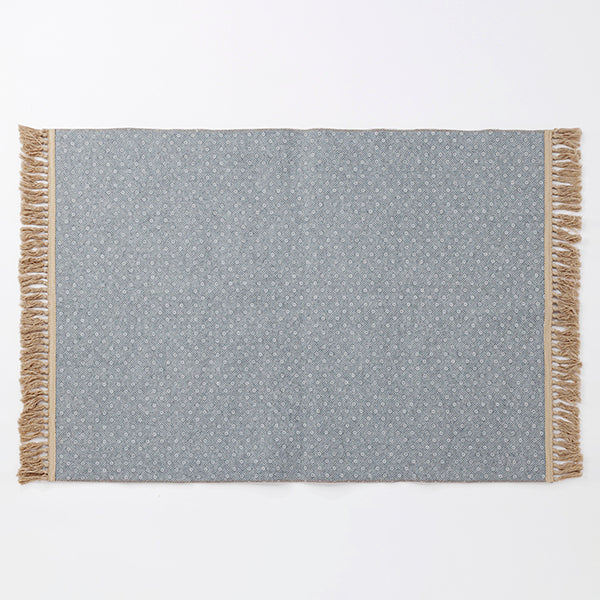 両端に施されたフリンジがさりげないアクセントとして効いていて、繊細なラインと大胆な幾何学模様が空間に深みを与えます。サイズは90cm×130cmと、玄関やソファ前、ベッドサイドなど使い勝手のいいちょうど良い大きさ。